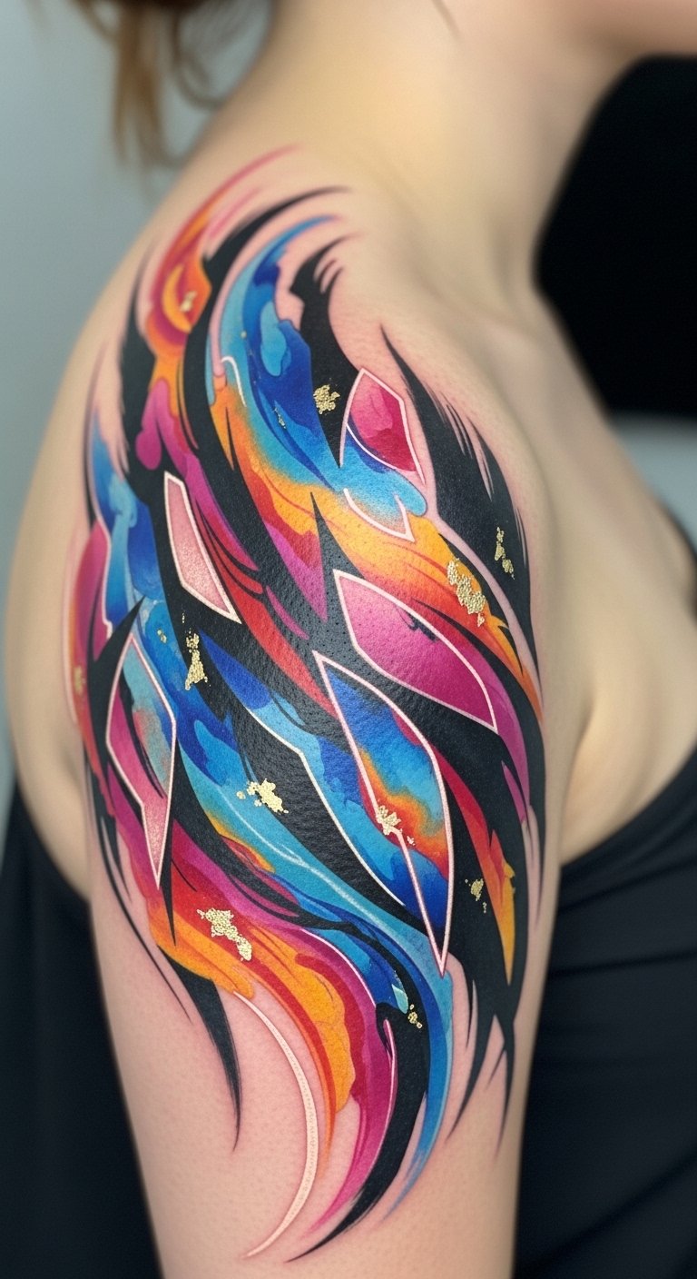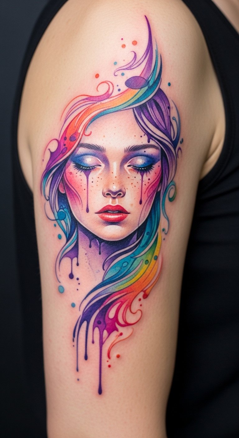 This design concept envisions a flowing watercolor sleeve that merges abstract washes of teal, magenta, and gold with soft, airy brushstrokes to suggest motion and freedom; symbolism centers on transformation and emotional release, the blending colors representing shifts in mood and identity while delicate edges convey vulnerability and openness. Emotionally the piece aims to feel uplifting and meditative—viewed up close it reveals subtle layers and transitions that invite reflection. Optimal placement is the outer arm wrapping toward the shoulder and upper chest so the composition can flow naturally with muscle lines and movement, allowing the tattoo to breathe and shift as the wearer moves.