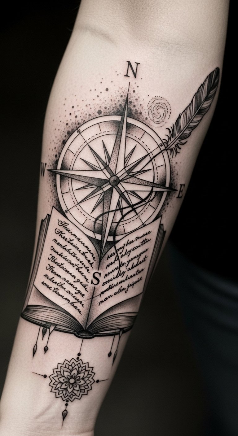 Whether it’s a cultural representation or a unique emblem, these tattoos empower you, allowing your skin to tell a story that resonates deeply with your spirit and embraces your freedom. The compass represents guidance and inner direction, the open book signifies knowledge and lived chapters, the mandala and feather honor cultural roots and lightness of being; together they evoke resilience, identity, and liberation.