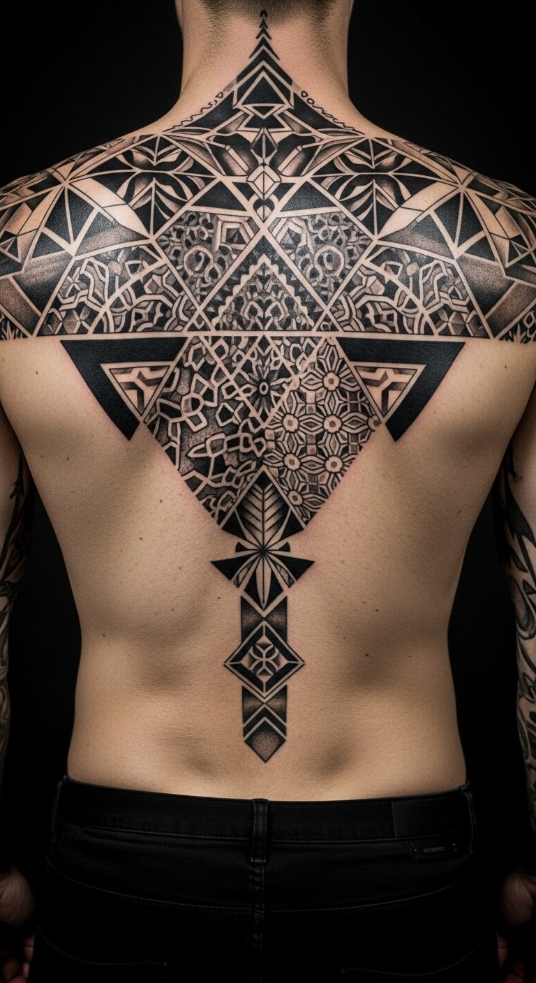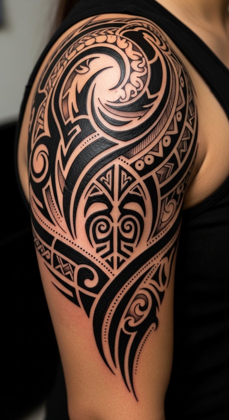 Use the provided text as the visual blueprint: a black-ink geometric sleeve combining tessellated hexagons, intersecting straight lines, and negative-space crescents that follow the arm’s natural curve from shoulder to wrist. Incorporate varying line weights and dotwork shading to add depth, with a focal mandala-like cluster on the upper arm that radiates outward into angular bands wrapping the biceps and forearm. Symbolically, the repeating geometric motifs represent balance, structure, and personal transformation; the interplay of solid shapes and negative space conveys empowerment and freedom, while the flowing alignment with musculature enhances and celebrates the body’s form. Optimal placement is along the arm where curves meet planes—shoulder, outer bicep, and forearm—to accentuate movement and create a striking, modern silhouette.
