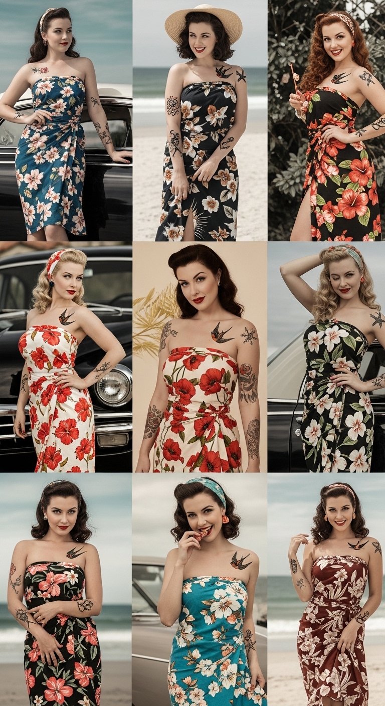 Embracing vintage-inspired tattoos as described captures nostalgia and feminine empowerment—think a graceful pin-up figure framed by looping retro florals and subtle banner accents; this composition symbolizes confidence, personal history, and a celebration of timeless beauty. Emotionally it evokes warmth, nostalgia, and playful freedom, making it ideal for visible placements like the upper arm, shoulder blade, or calf where the curved lines and flowing details can complement the body’s contours and be easily shown or covered as desired.