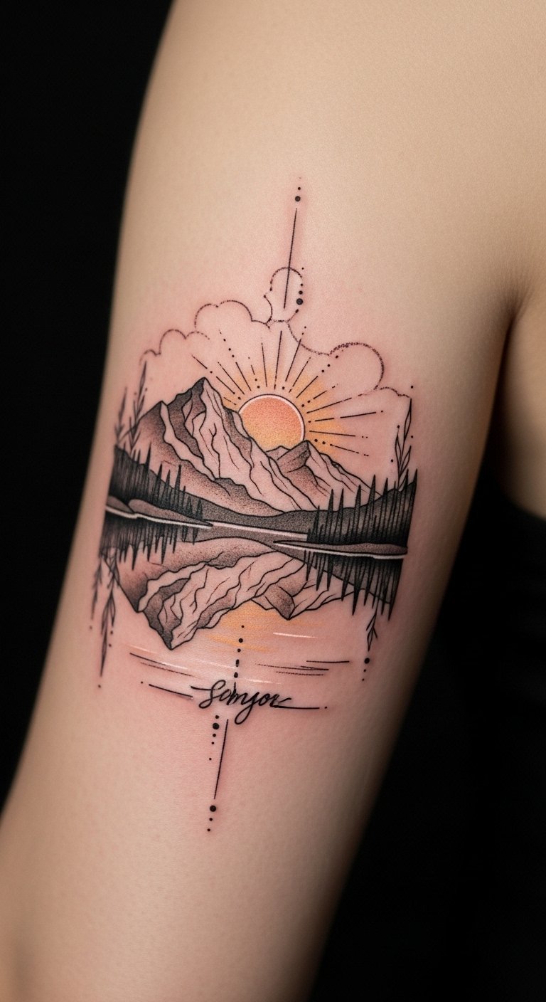This design blends nostalgic aesthetic and natural grandeur to symbolize personal journey and inner calm—the mountains for resilience, the lake for introspection, and the reflection for self-awareness—evoking serene, uplifting emotion; ideal for forearm, upper back, or rib placement where it can be shown or kept private, sized to flow with body contours and enhance movement.