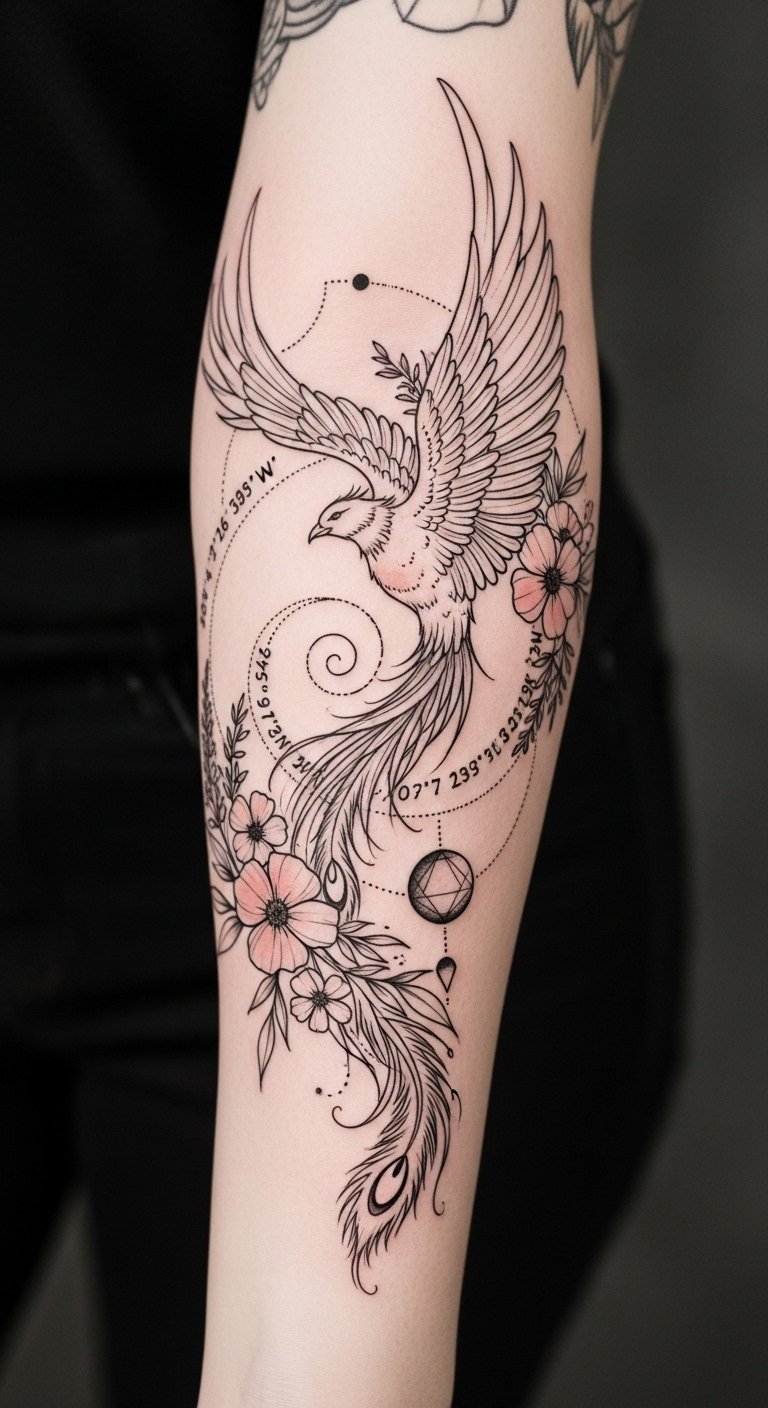 Thoughtful tattoo placement transforms your body into a canvas of custom designs that celebrate who you truly are. The phoenix symbolizes rebirth and resilience, the wildflowers represent personal growth and fleeting beauty, the coordinates anchor the design to a meaningful place or moment, and the moon adds quiet guidance; together they convey transformation, memory, and identity.