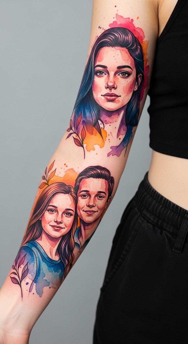 This design pairs intimate, colorful portraits with botanical and flowing elements to symbolize growth, memory, and connection; warm jewel tones and watercolor effects evoke emotion and vibrancy while fine-line details preserve likeness and tenderness. Placed on the forearm it offers a visible daily reminder of the bonds that uplift you; on the chest it sits close to the heart, signifying deep devotion. The composition wraps and moves with the body’s contours so each glance reveals layers of story, confidence, and love.