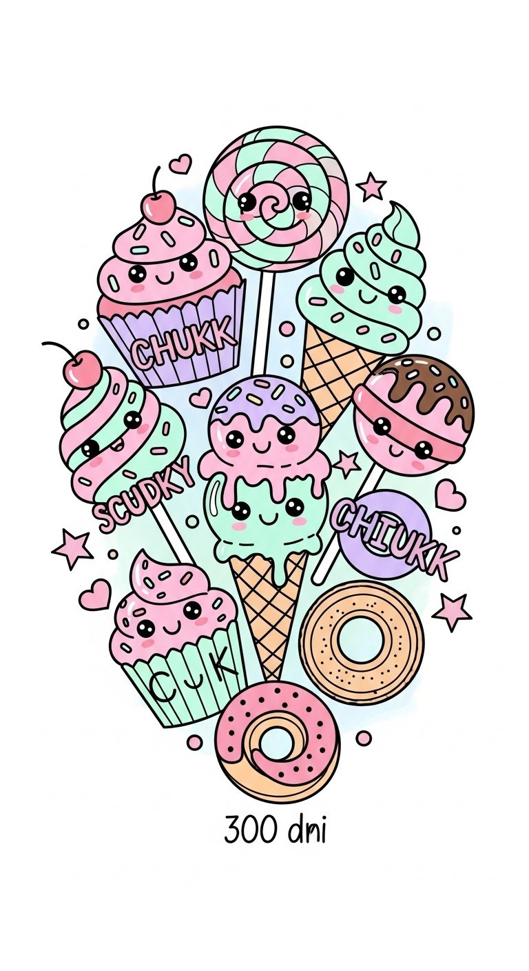 This design symbolizes joy, nostalgia, and a lighthearted embrace of personal indulgence; the smiling desserts and vibrant pastels convey playful confidence and a reminder to savor life’s small pleasures.