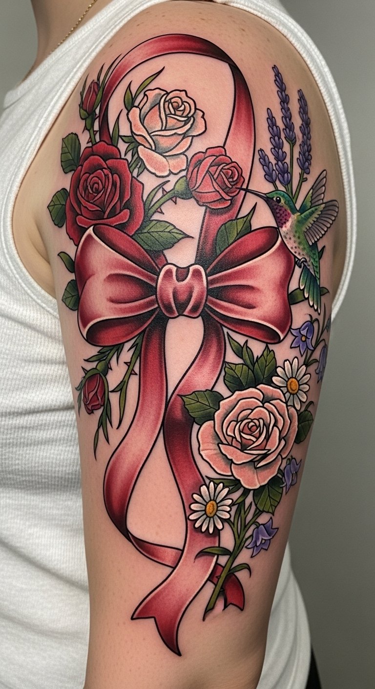Symbolically, the bow represents love, beauty, and the tying together of meaningful experiences, while the surrounding blooms—roses for passion, peonies for honor, or wildflowers for spontaneity—add layers of personal narrative and emotional depth.