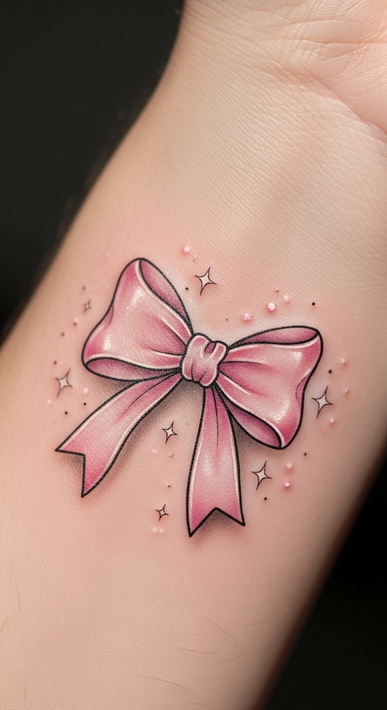 Soft and charming, a pastel pink bow tattoo on the wrist adds a touch of whimsy to your personal style.