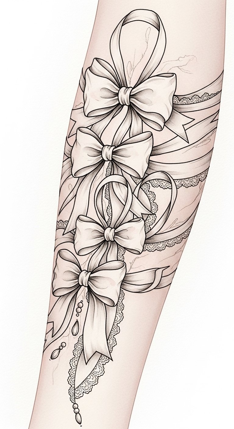 While exploring the world of bow tattoos, the layered bow and ribbon motif stands out as an enchanting choice that embodies elegance and depth.