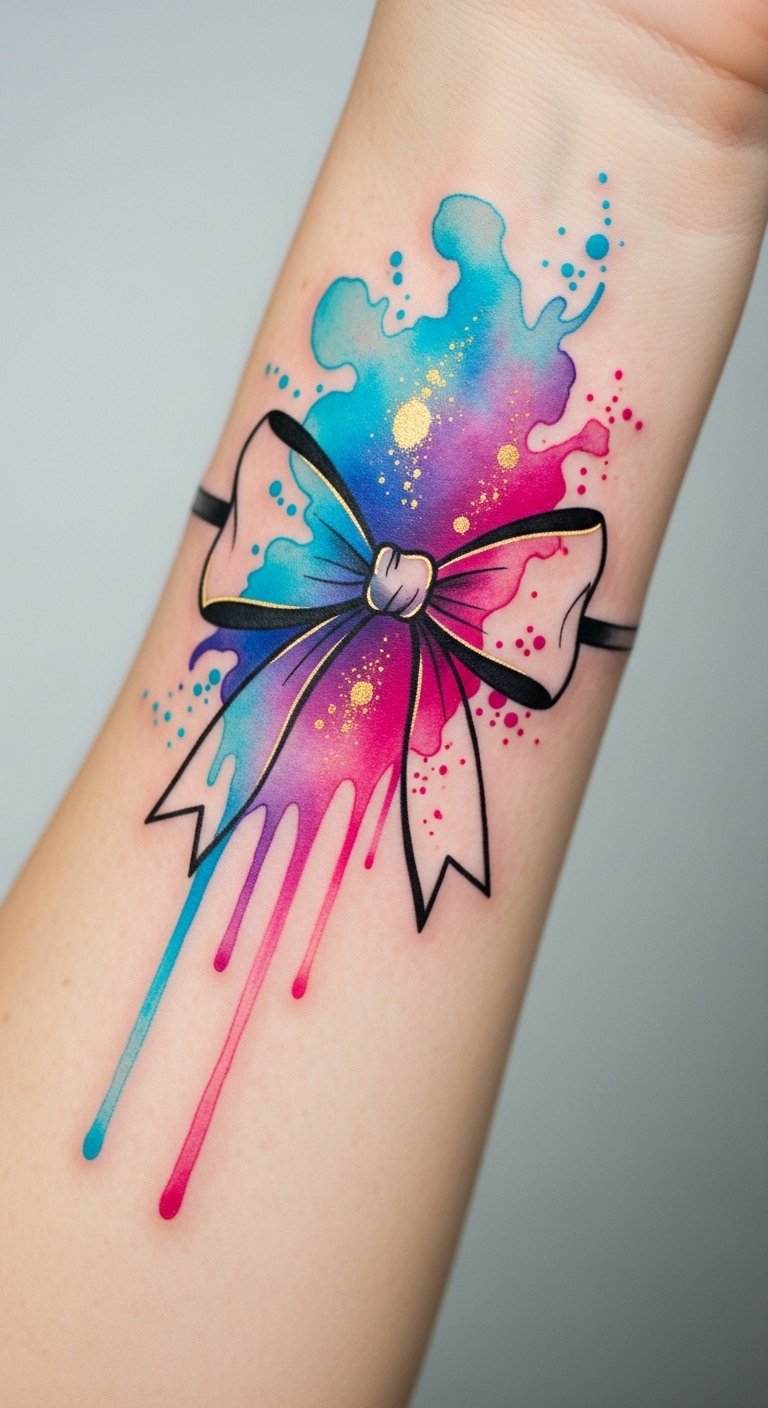 Watercolor bow tattoos bring a fresh and vibrant twist to the classic design, infusing your ink with a splash of color and artistry.