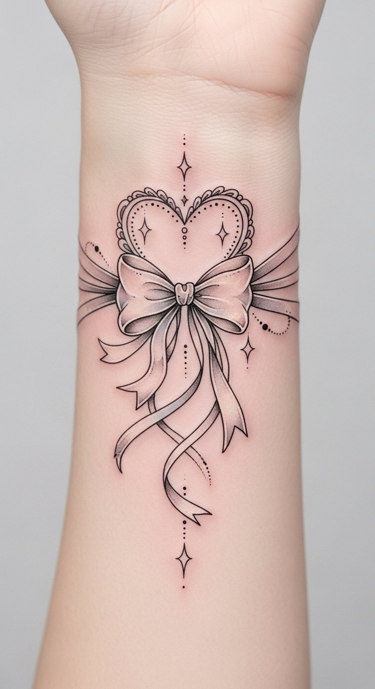 The heart-shaped bow symbolizes playful romance and self-expression, blending whimsy with intimate sentiment; delicate filigree and pastel watercolor accents convey tenderness and joy, while fine-line detailing keeps the design elegant and timeless.