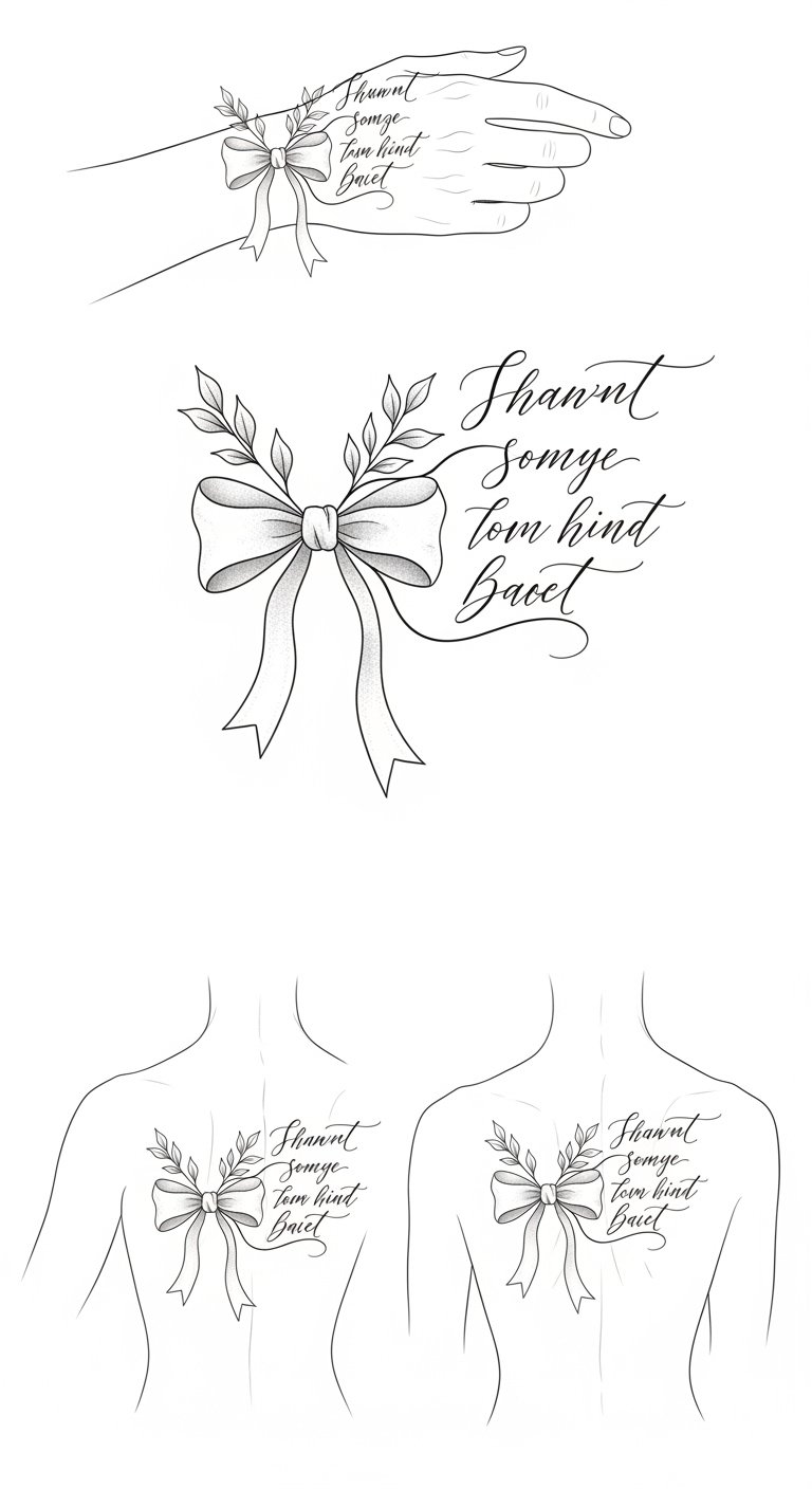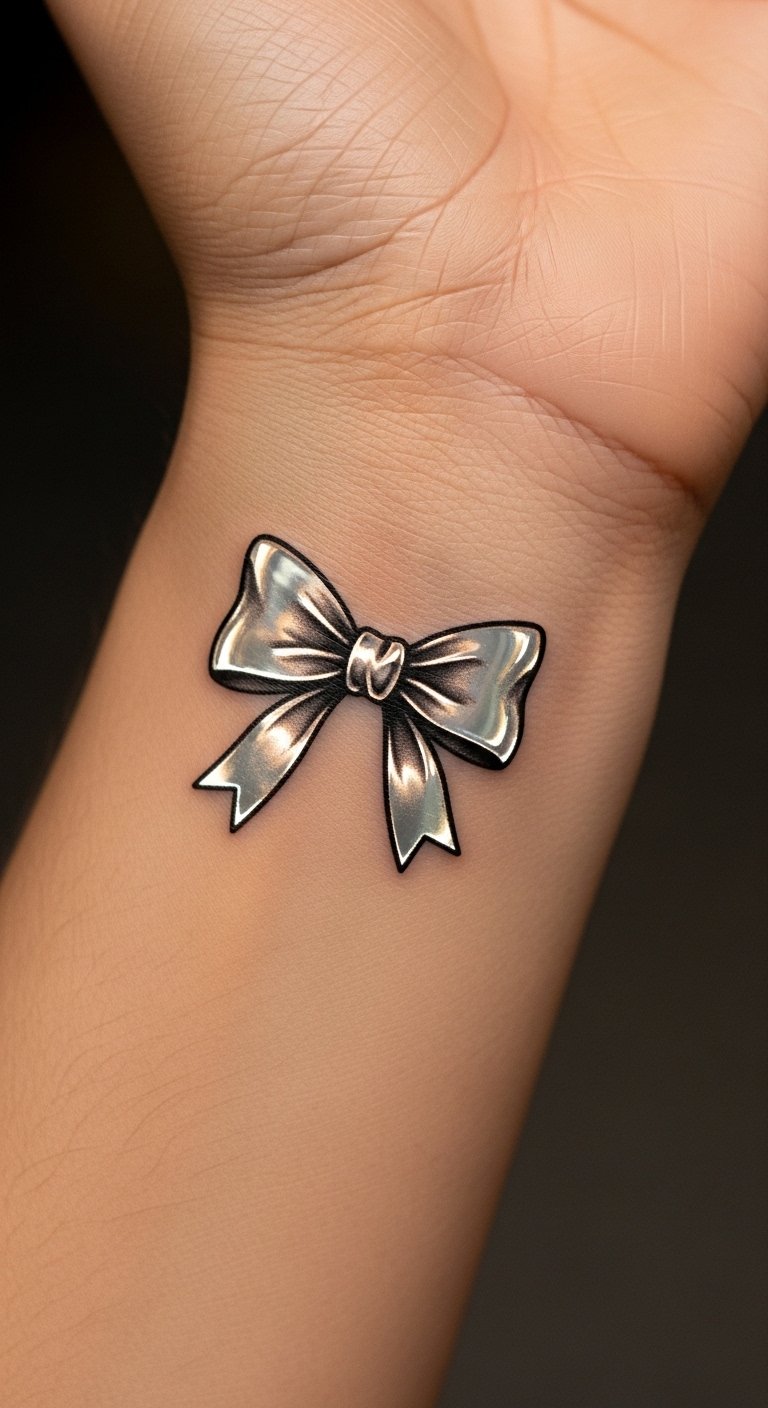 This design concept centers on a sleek, mirrored bow rendered with soft metallic shading and subtle highlights to evoke reflection—pair it with fine line details and negative space to keep it delicate yet striking. Symbolically it represents resilience, personal strength, and the freedom to move forward; emotionally it should feel both empowering and tender, suitable for someone commemorating growth or transformation. Ideal placements include the inner wrist for daily affirmation, the upper back for a private symbol, or the ankle for a discreet accent; adjust scale and line weight to match the wearer’s style and skin anatomy.