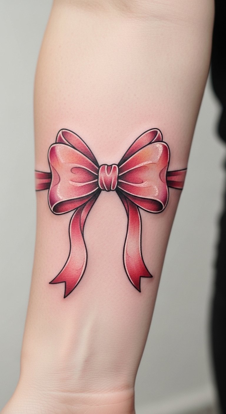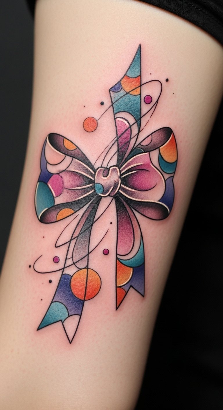 A colorful gift bow tattoo can symbolize celebration, love, and a joyful embrace of life’s moments; place it on the outer shoulder, wrist, or ankle to allow the vibrant hues—reds for passion, blues for tranquility, and complementary tones for individuality—to interact with natural contours and movement.