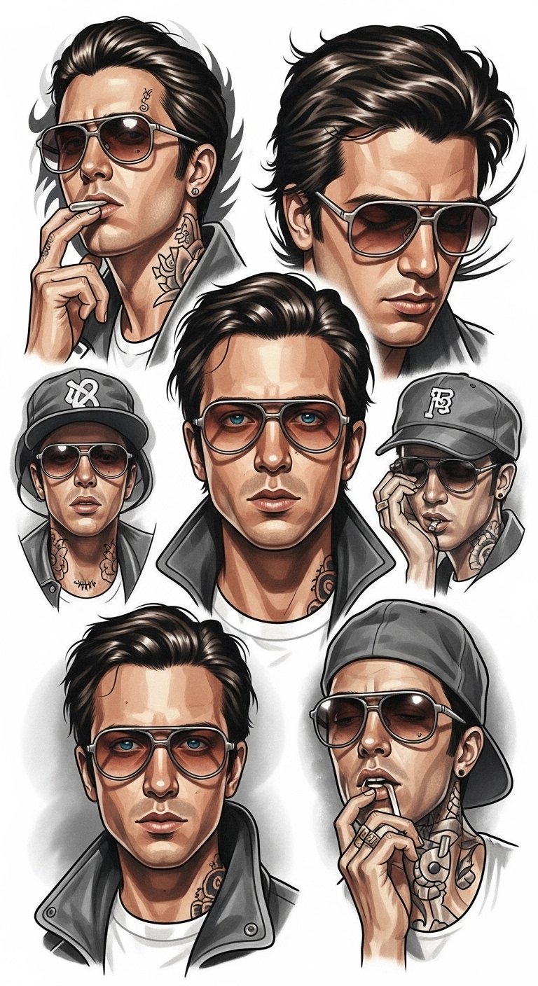 This design channels nostalgia and celebration: the fedora represents Bruno Mars’s stage persona and confidence, the aviator sunglasses signal cool detachment and charisma, and the musical notes merging into palm leaves evoke tropical rhythms and a liberating, carefree spirit. Use vibrant colors and watercolor splashes to convey joy and energy; place as a 3/4 sleeve or upper arm piece for visibility during performances and social moments, or scale down to a forearm or chest tattoo for a more intimate personal tribute.