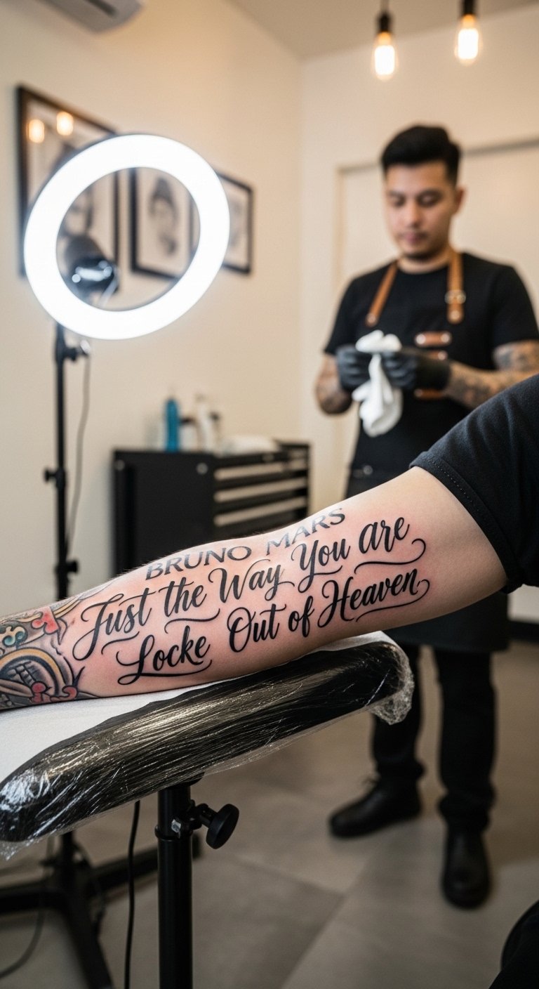 A design concept: flowing, handwritten lyric lines woven into a delicate ribbon or banner, accented with small icons — a vintage microphone, a single rose, and subtle starbursts — rendered in fine black ink with soft watercolor washes in warm golds and deep blues; ideal placements include the inner forearm, along the ribcage, or across the collarbone to follow natural contours and allow the words to read fluidly. This tattoo symbolizes personal affirmation and romantic intensity, the microphone nodding to musical identity, the rose to love and admiration, and starbursts to moments of transcendence from the song; emotionally it serves as a reminder of confidence and meaningful connection, visible when you want to share it and private when tucked under clothing.