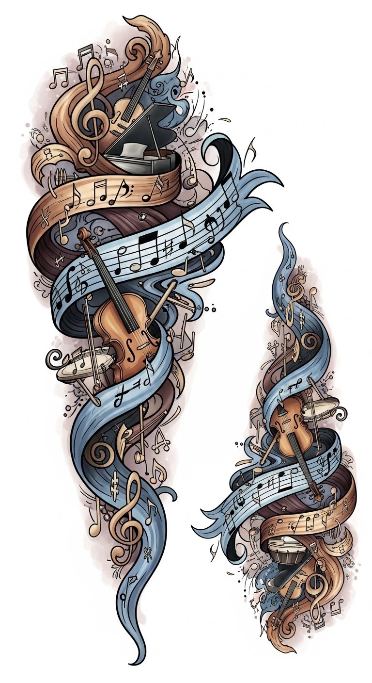 A swirling composition of piano keys flowing into a guitar neck woven with musical notes and subtle silhouettes of Bruno Mars in performance, rendered in bold black linework with watercolor splashes of gold, teal, and crimson; ideal for forearm or upper chest placement to follow the body’s natural contours and movement, evoking liberation, joy, and an intimate bond to music while symbolizing personal expression, artistic influence, and the celebration of rhythm in everyday life.
