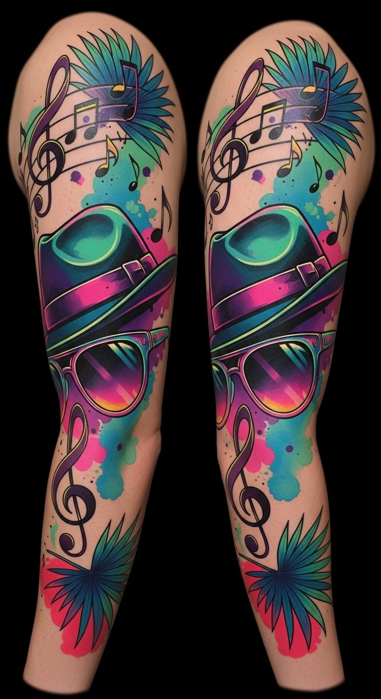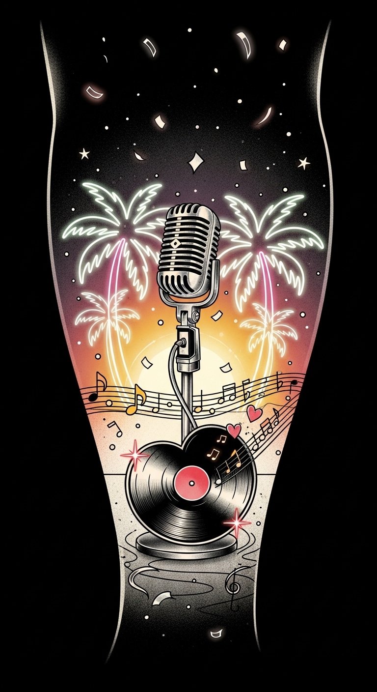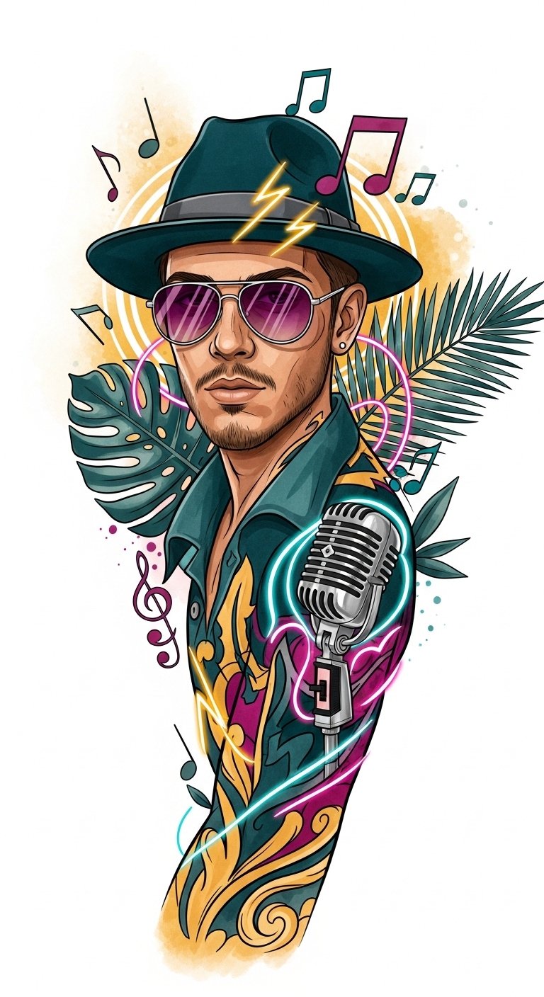 A dynamic sleeve or chest piece blending a vintage microphone draped with a fedora and palm leaves, neon record grooves curling into musical notes and concert ticket stubs; colors echo warm golds, emerald greens, and sunset oranges to mirror retro glamour and concert lights. Symbolically it fuses performance, style, and shared memories—microphone for voice and stage presence, fedora for signature look, palms for Hawaiian roots and laid-back charm, records and tickets for the lived concert moments. Emotionally it conveys joy, nostalgia, and communal celebration; ideal placement is a forearm sleeve wrapping toward the shoulder or a chest piece spanning clavicle to sternum where visibility meets intimacy.