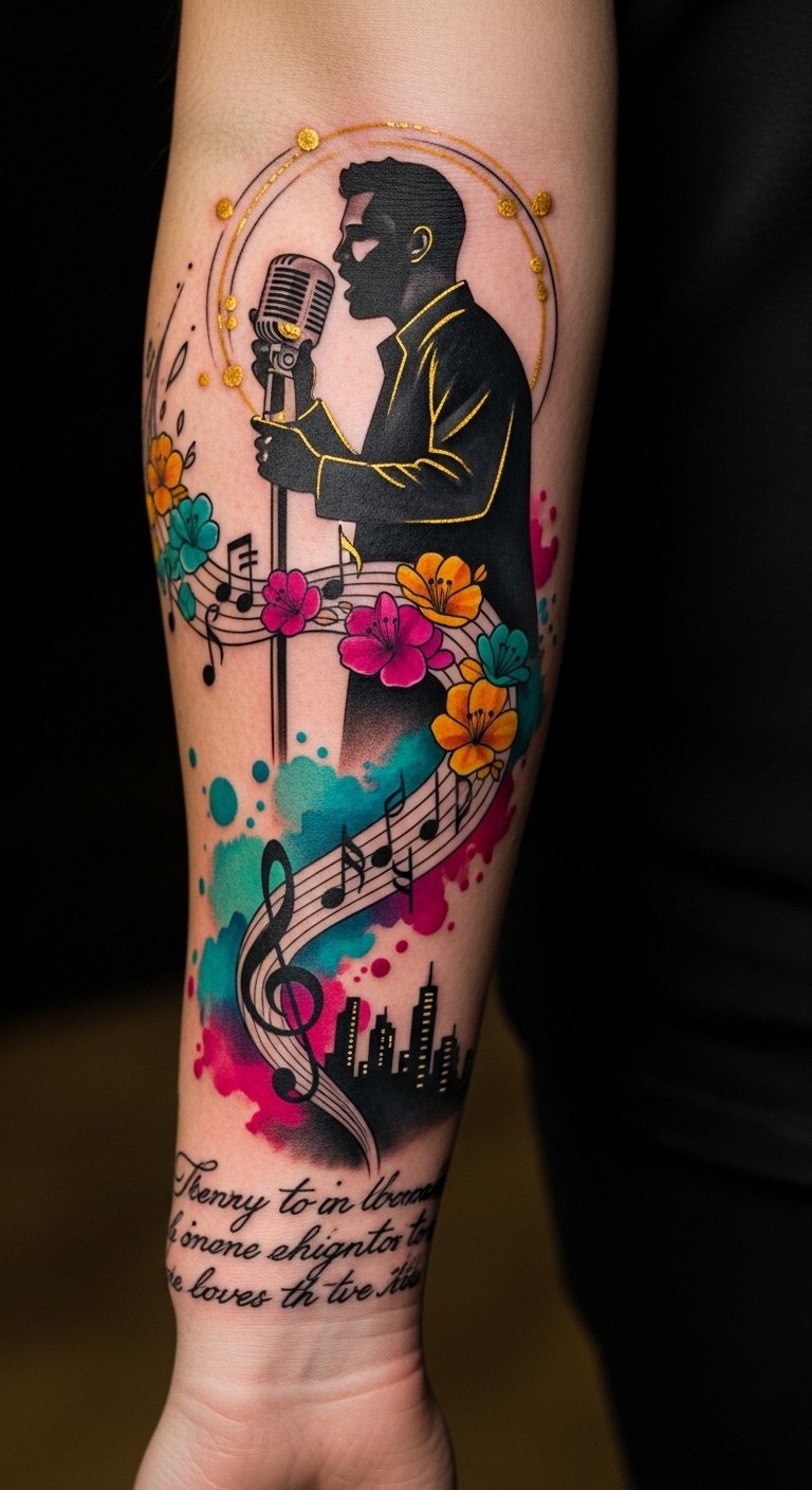 The design weaves together performance energy (silhouette and mic) and personal feeling (vinyl-heart, highlighted lyrics) to symbolize connection, nostalgia, and joy; fine-line and selective color let it feel intimate yet celebratory, ideal along the forearm for visibility and movement or over the chest near the heart for emotional resonance.