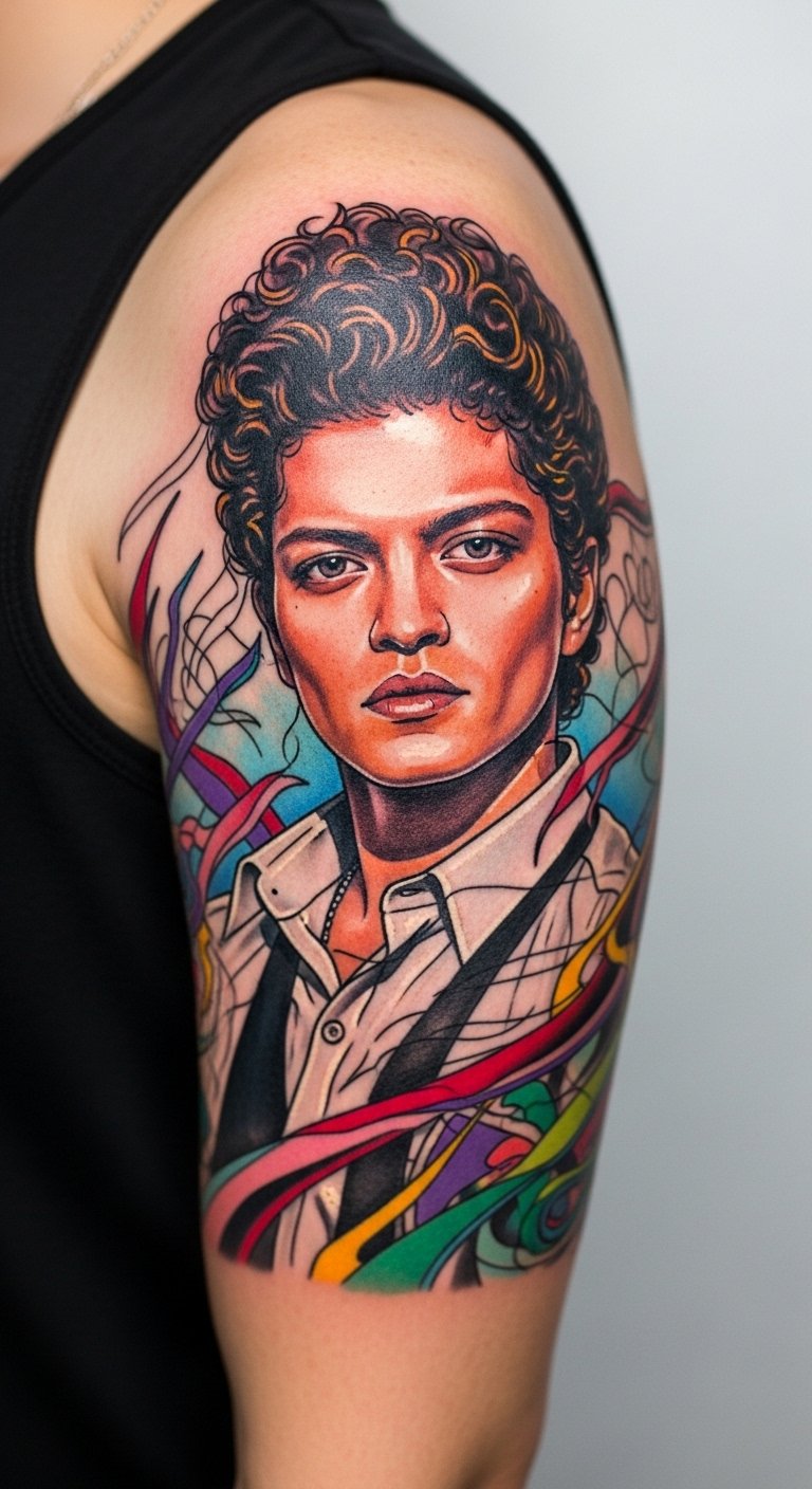 If you’re a fan of Bruno Mars, you know his music resonates deeply. Tattoos inspired by his unique style capture his essence in vibrant artistry. From striking portraits to lyrical banners, these designs tell personal stories that connect fans to his musical journey. As you explore these stunning tattoos, you might just find the perfect tribute that reflects your own love for his work. What design speaks to you the most? The portrait symbolizes admiration and musical legacy, the microphone and notes represent voice and rhythm, and the lyrical banner links personal meaning to favorite songs; emotionally it aims to evoke joy, nostalgia, and connection, making an ideal placement on the forearm or upper arm where the piece can be easily shown or covered, wrapping with the muscle lines for a natural flow.