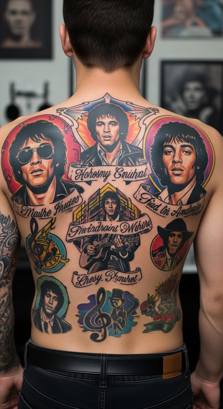 The portrait and musical elements symbolize devotion to his music and persona, the lyrical spine script anchors personal connection and memory, and the warm retro tones evoke nostalgia and joy; placement across the upper back allows a protected, large canvas for detailed artistry while enabling occasional display, making the piece both intimate and celebratory.