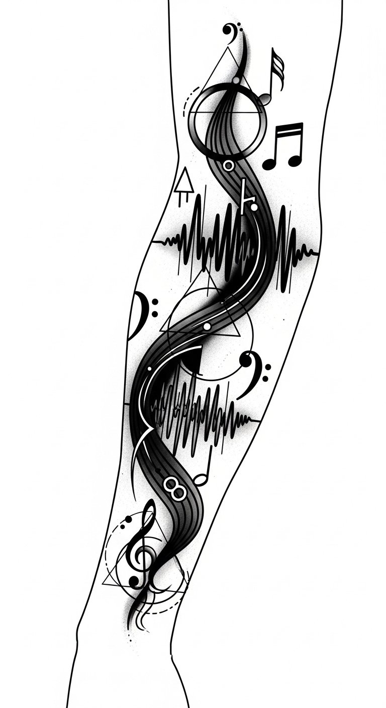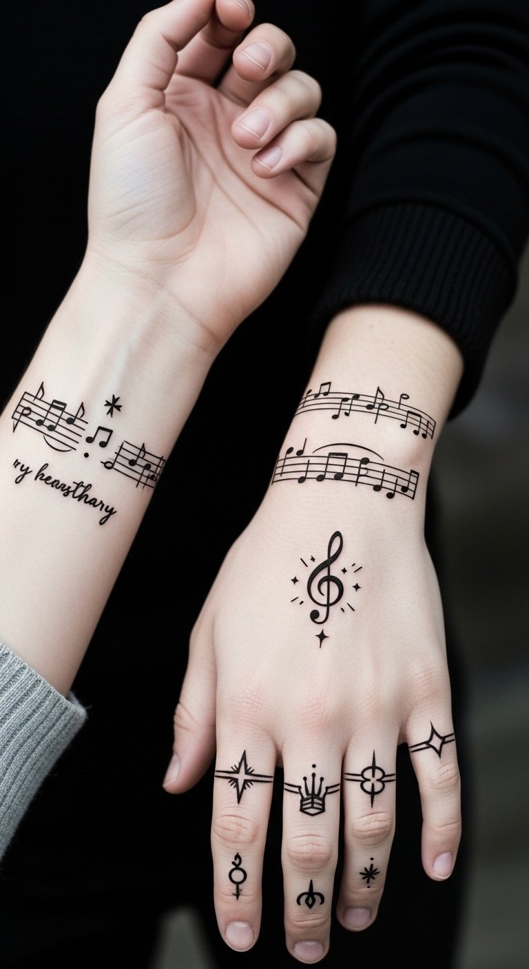 When placed on the inner wrist, a thin flowing staff with a small treble clef and a single lyric snippet evokes constant connection to the music and keeps the wearer grounded; on the outer wrist, bolder note clusters and small palmistry-inspired symbols broadcast confidence and performative flair.