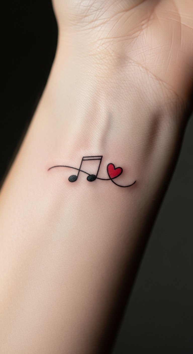 This design pairs the musical note and heart to symbolize passion and melody—an intimate nod to emotion and rhythm—evoking warmth and steady devotion; ideal placement is on the inner wrist or behind the ear for a private yet visible reminder that blends with daily gestures.