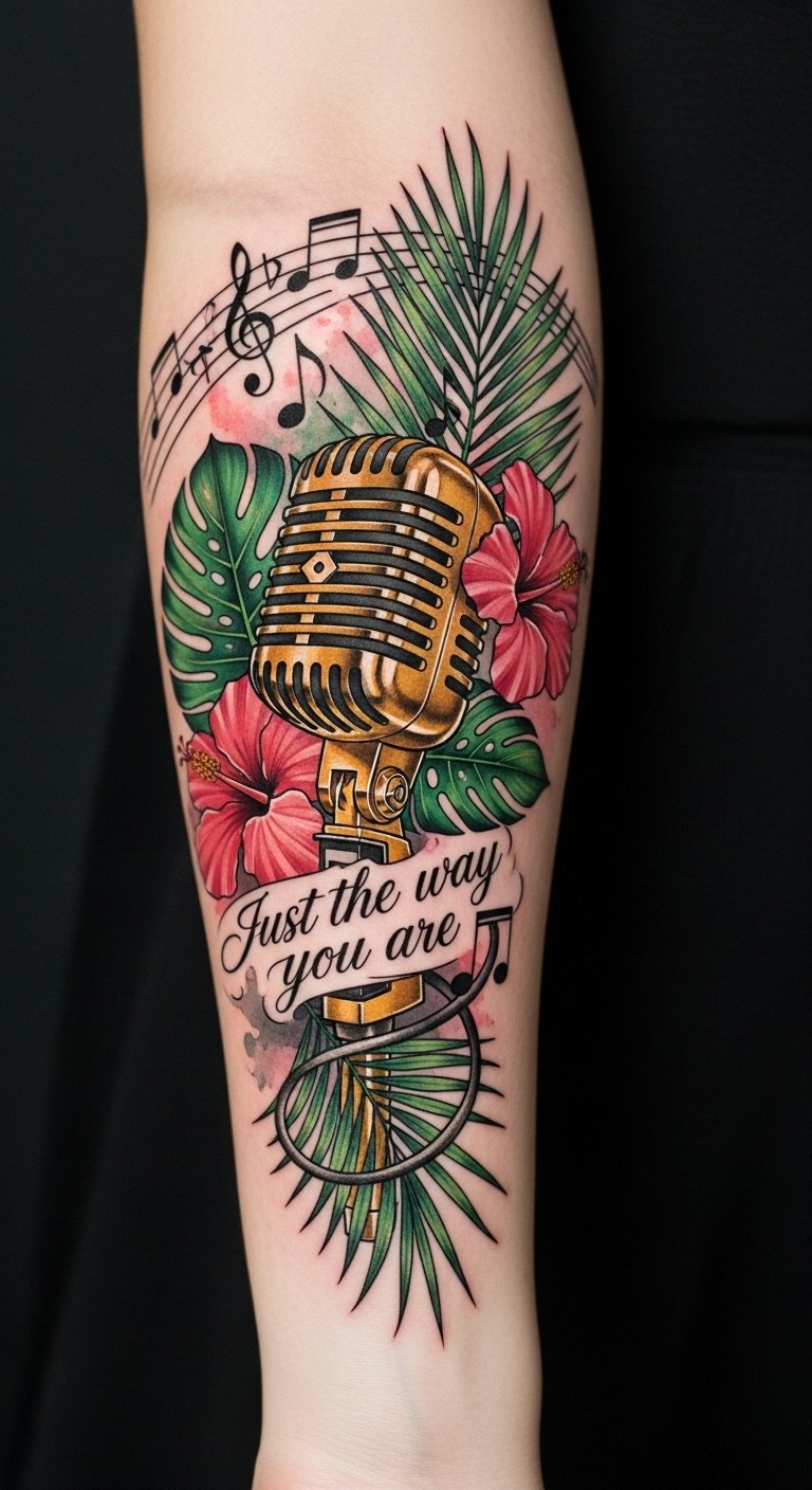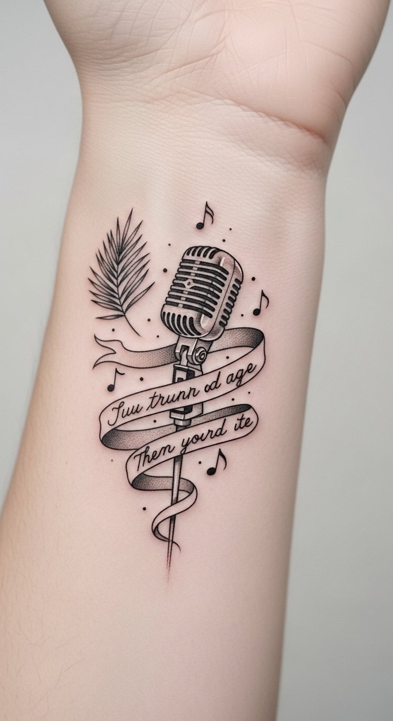 It’s freedom in ink! The vintage microphone symbolizes voice and performance, the handwritten lyric ribbon captures a personal, emotional line from a favorite song, the musical notes echo rhythm and melody, and the palm leaf hints at tropical warmth and relaxed charm; together they evoke nostalgia, intimacy, and joy—ideal for intimate placements such as the inner wrist, behind the ear, or along the collarbone where the design can be both private and proudly shown.