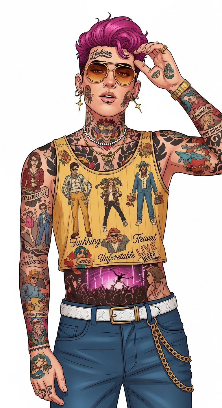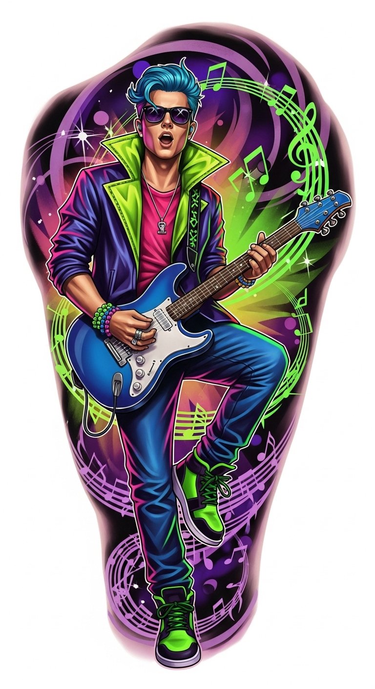 When translated into a tattoo, this concept becomes a sleeve or chest piece that layers bold color blocks and stylized motifs from Bruno Mars’s visual palette—retro neon gradients, palm silhouettes, vintage microphones, and geometric sunbursts—interwoven with personal symbols for the wearer. The design symbolizes celebration, confidence, and musical joy, conveying nostalgia and modern swagger through saturated hues and clean lines. Ideal placement is the forearm, upper arm sleeve, or across the chest where the dynamic flow can follow muscle contours and be easily shown or concealed depending on the occasion.