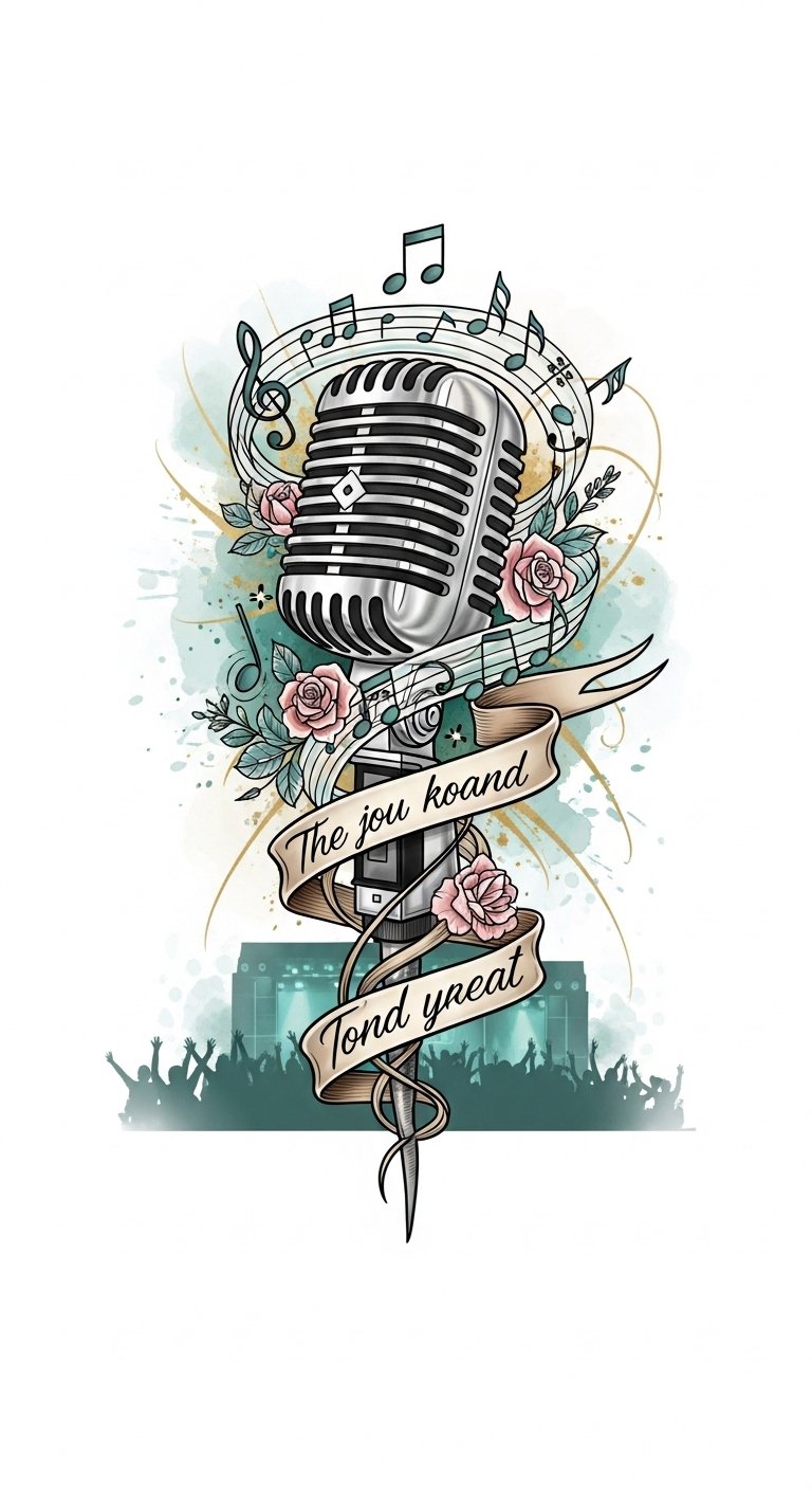 The microphone symbolizes voice and performance, the musical notes and ribbon honor the songs and name that shaped personal memories, roses add romance and growth, watercolor splashes evoke the vibrancy of live shows, and the crowd silhouette anchors the piece to shared concert experiences;