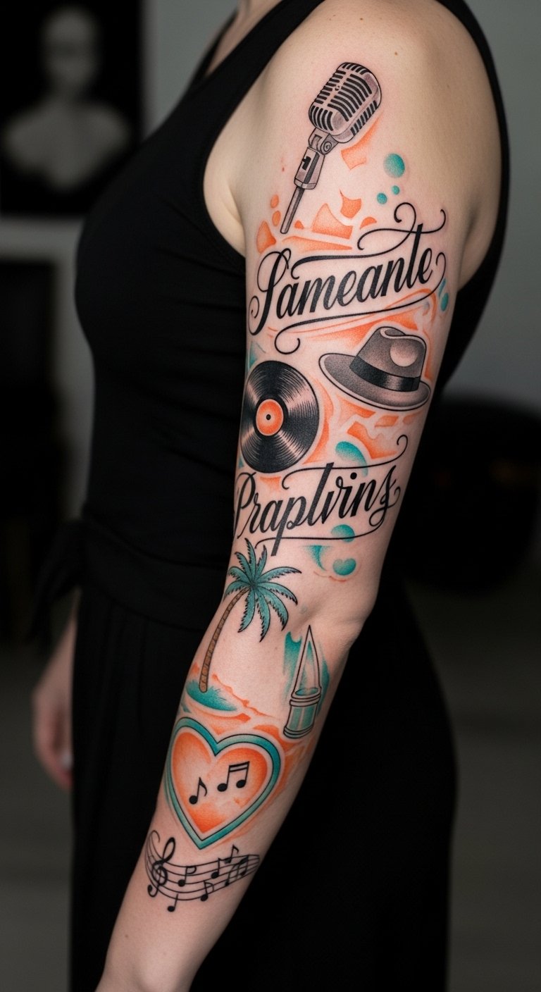 For placement, this sleeve wraps from shoulder to forearm, allowing larger elements like the fedora silhouette and vinyl record on the upper arm, with lyrical script flowing down to finer icons near the wrist; emotionally the design merges nostalgia and celebration, each small image and lyric acting as a personal milestone that together form a tapestry of devotion.