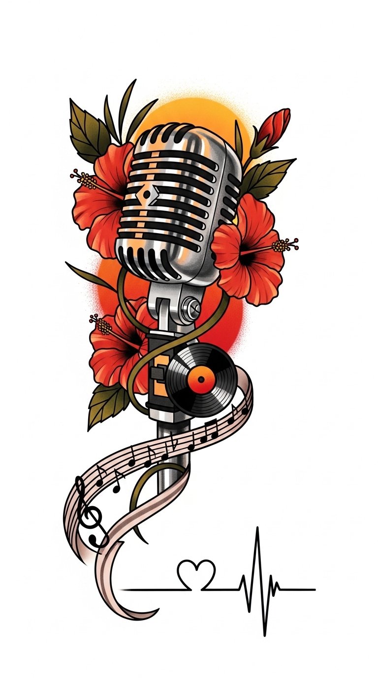 A compact design blending the retro microphone and vinyl symbolizes Bruno Mars’ vocal charisma and musical roots; hibiscus flowers add tropical warmth referencing his Hawaiian heritage, while the sheet-music ribbon flowing into a heartbeat line conveys the emotional pulse his songs create.