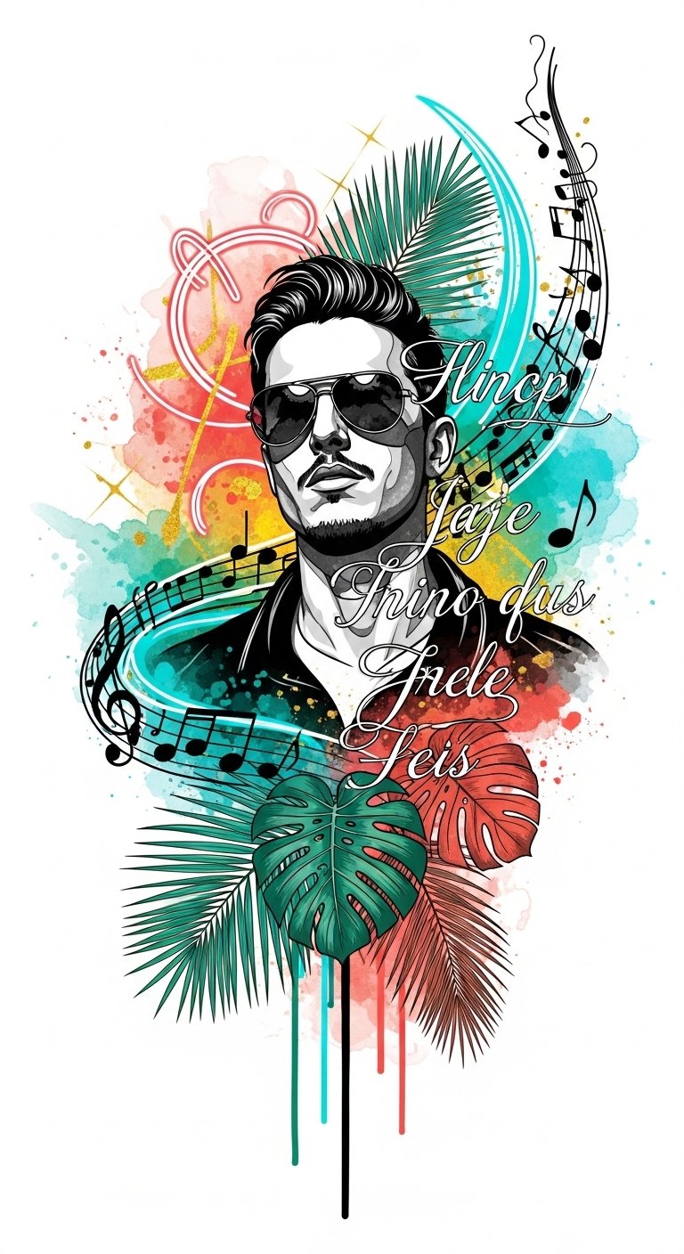 Symbolically it blends personal admiration (portrait) with musical identity (notes) and tropical roots (palm leaves), evoking joy, charisma, and nostalgia.