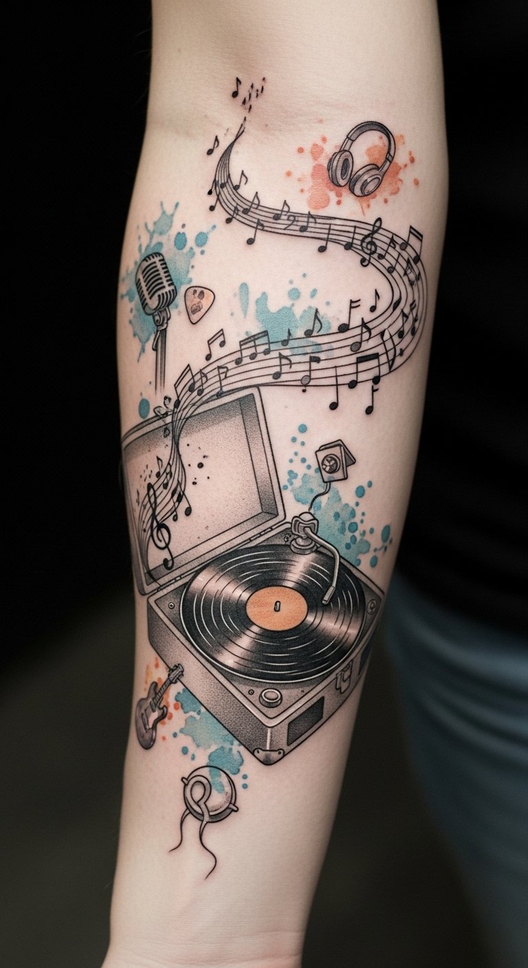 Placement along the forearm keeps the imagery visible and intimate, following the arm’s curve to suggest movement and rhythm; the muted watercolor tones add warmth and reverence, while the fine-line details invite close inspection, like listening closely to a favorite track.