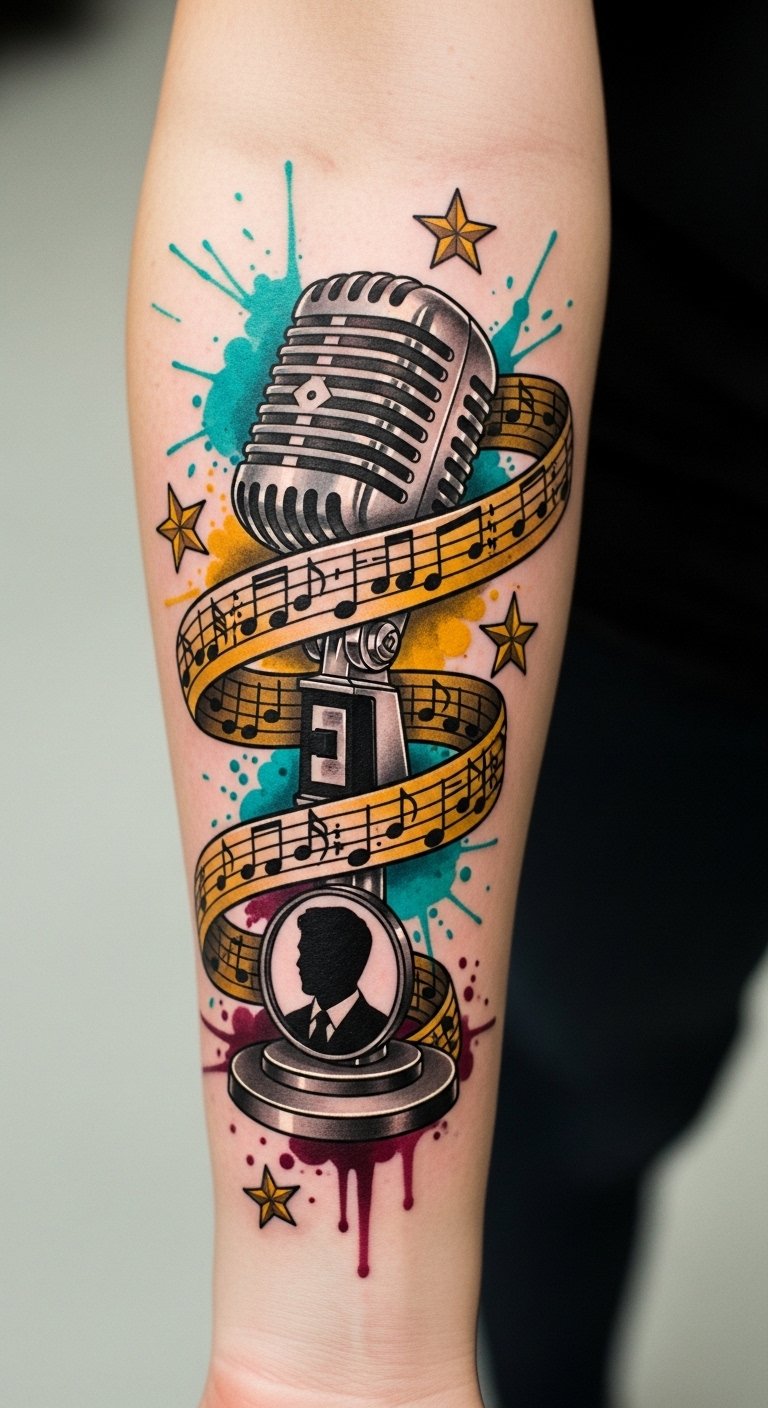 This design channels the original passage’s focus on celebrity tattoos as vivid expressions of fandom: the vintage microphone and Bruno Mars silhouette represent the artist and his influence, the ribbon of musical notes signifies creativity and the shared love connecting fan and star, while stars and paint-splatter accents evoke freedom and passionate devotion.