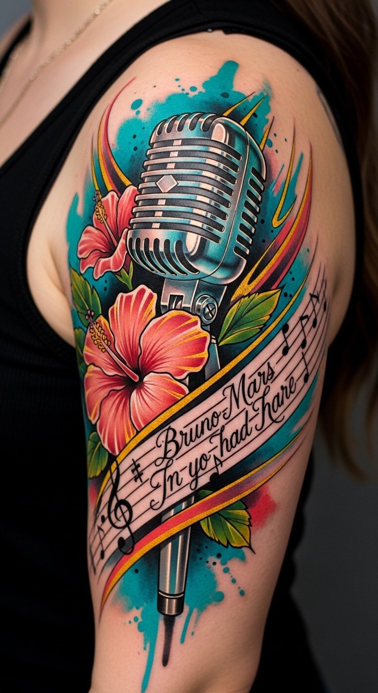 As a design concept, envision a bold upper arm sleeve centered on a stylized vintage microphone wrapped in tropical foliage and retro neon accents; include subtle musical notes, a small silhouette of Bruno Mars in a signature pose, and a banner with a favorite lyric. The vibrant colors and intricate linework mirror the original text’s emphasis on artistry and personal expression, conveying celebration, nostalgia, and joy. Placed on the outer upper arm, the piece offers visibility and the option to extend into a half or full sleeve, allowing wearers to showcase their connection to Bruno Mars while keeping the design adaptable to personal size and color preferences.