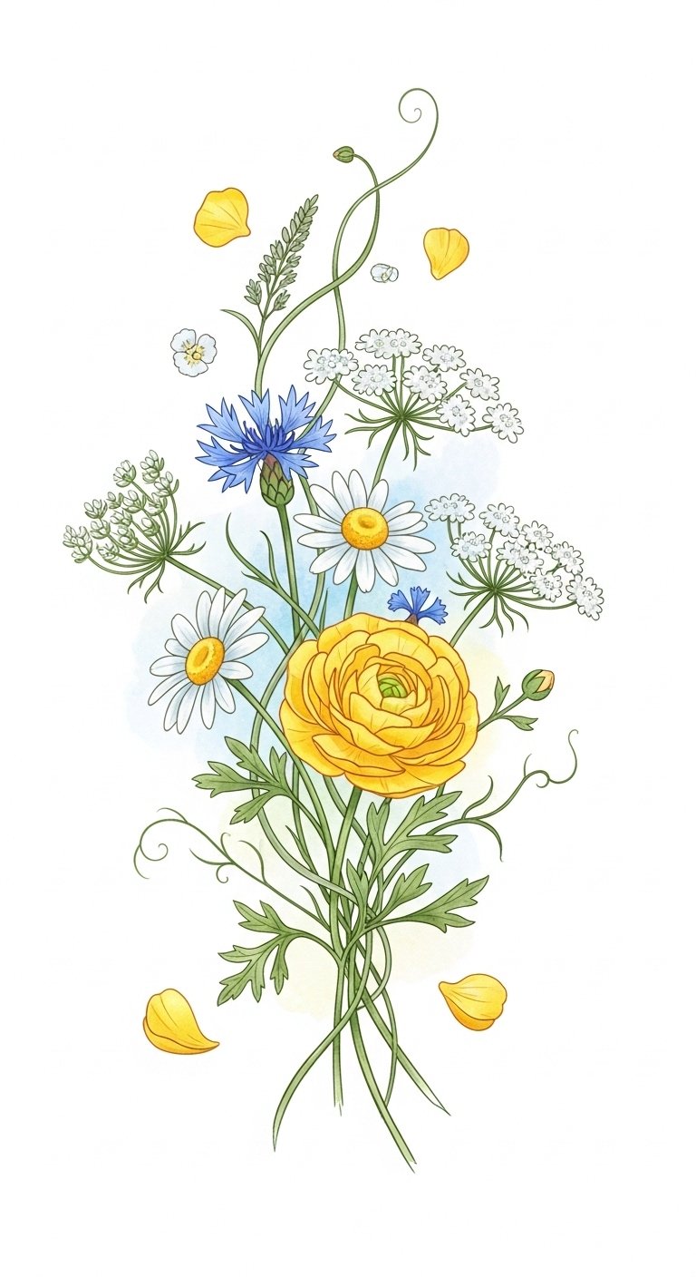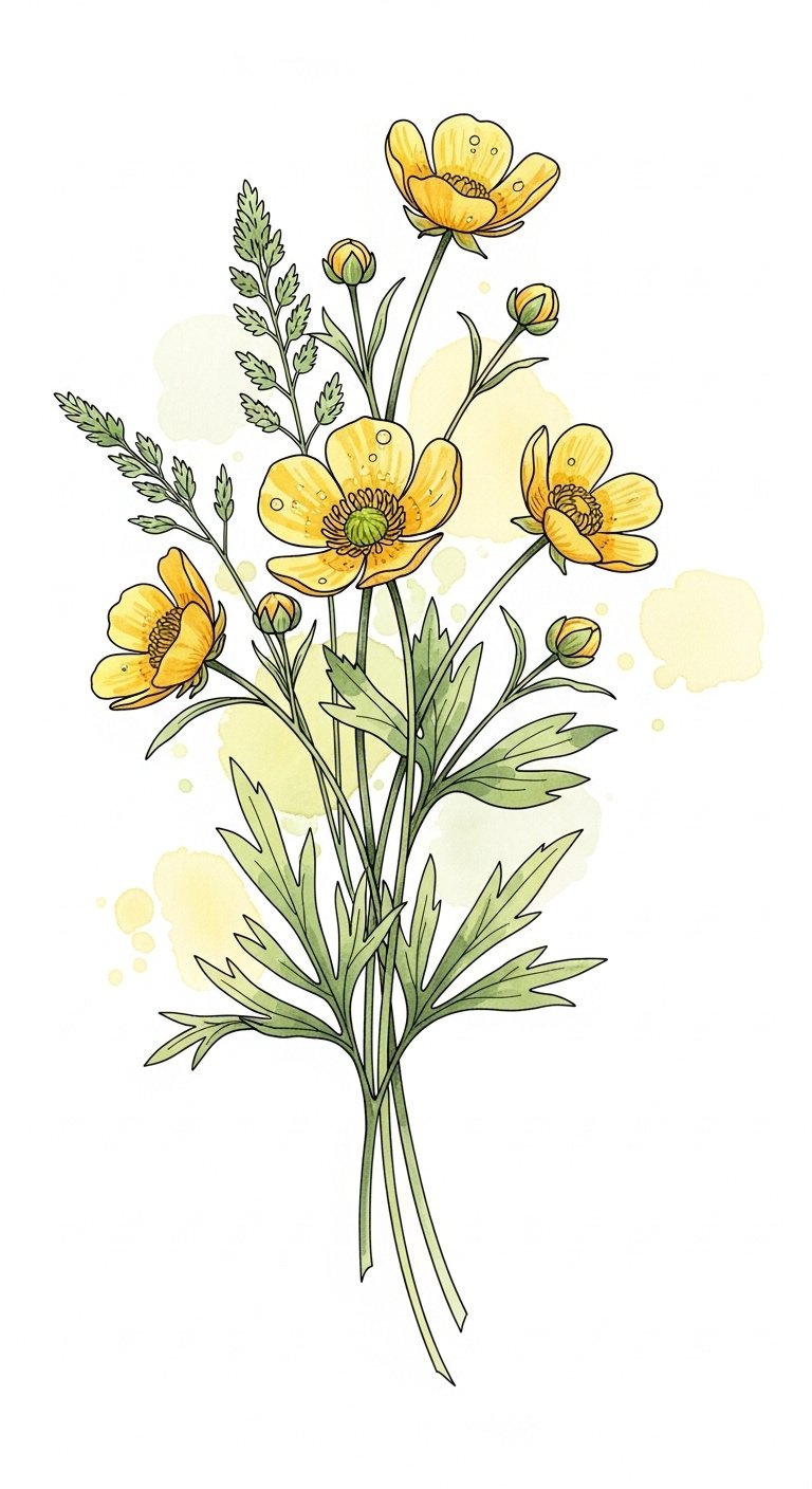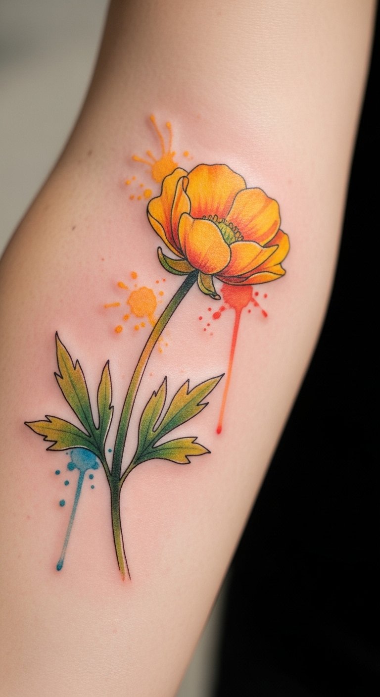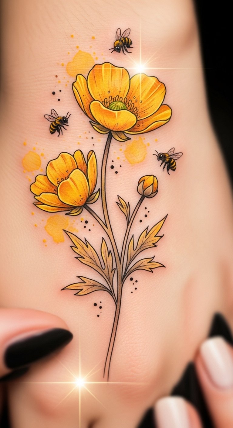 This design concept channels the gentle optimism and resilience of the buttercup through loose, flowing washes and luminous yellow-gold petals contrasted with soft green stems and hints of warm orange at the flower centers; emotionally it suggests joy, renewal, and personal growth, suitable for placements that move with the body such as the forearm, shoulder blade, ribcage, or ankle where the watercolor effect can wrap and flow naturally, allowing each brushstroke to read like a personal narrative.