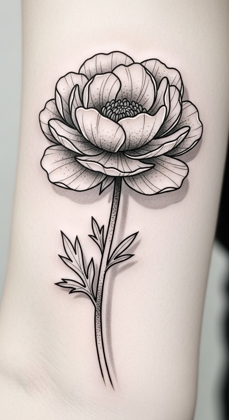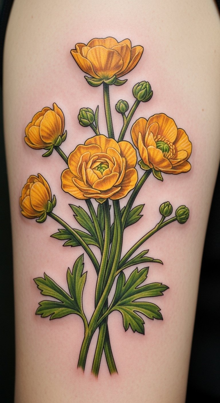If you’re seeking a tattoo that combines bold aesthetics with symbolic depth, a neo-traditional buttercup piece might just be your ideal choice.