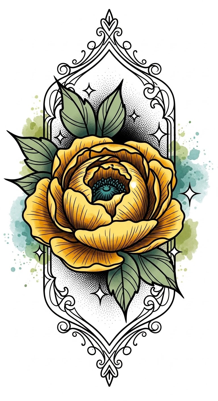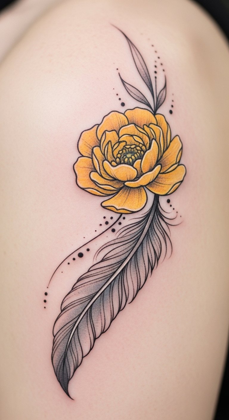 This design effortlessly merges artistry and meaning, making it a perfect choice for personal expression. Place along the forearm or ribcage for a flowing, intimate composition; the warm yellow tones convey optimism and courage, while fine shading and delicate linework emphasize vulnerability and perseverance.