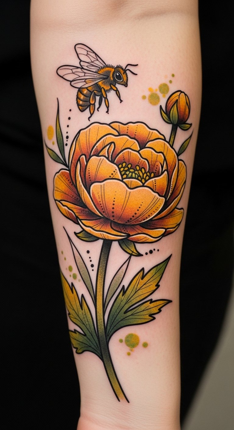 Building on the striking visuals of a neo-traditional buttercup, combining it with the delicate presence of a bee creates an enchanting tattoo that symbolizes harmony and the beauty of nature.