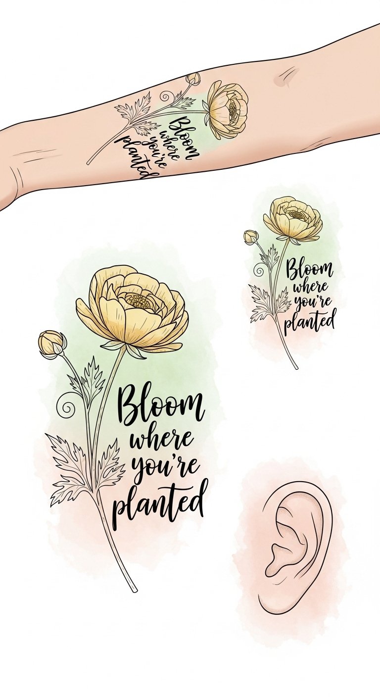 The delicate buttercup symbolism embodies joy and growth, while growth quotes like “Bloom where you’re planted” remind you of your journey. Together, they create a powerful statement of resilience, encouraging you to embrace change and flourish in your freedom.