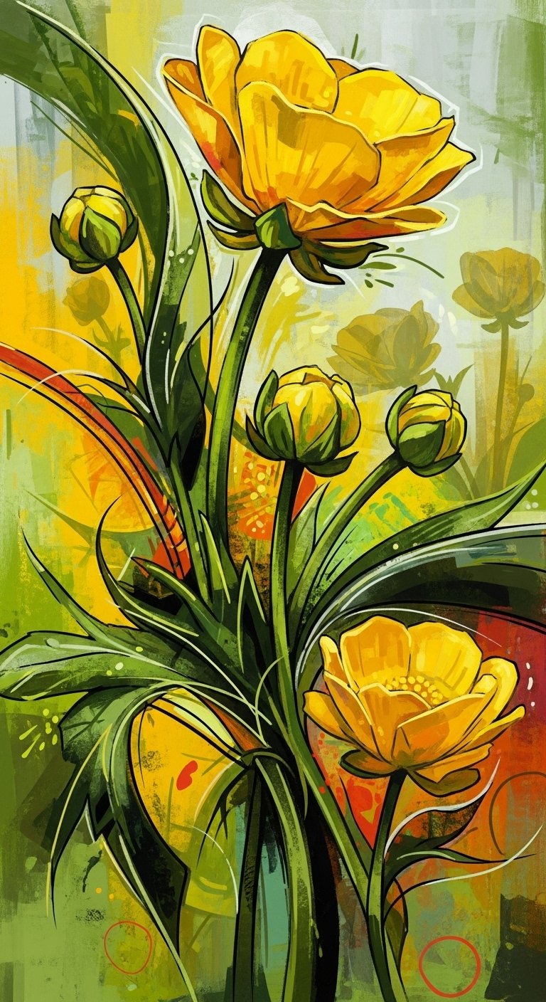 As a tattoo concept this design uses the stylized buttercup as a personal emblem of growth and self-expression: bold colors and intricate patterns convey confidence and individuality, while flowing linework and watercolor washes evoke movement and the feeling of a journey. Emotionally the piece reads as celebratory and empowering, suitable for someone marking transformation or freedom. Recommended placements—forearm, shoulder blade, or ribcage—allow the composition to follow the body’s natural curves, letting the “dancing” petals animate with motion and remain visible or intimate depending on the wearer’s preference.