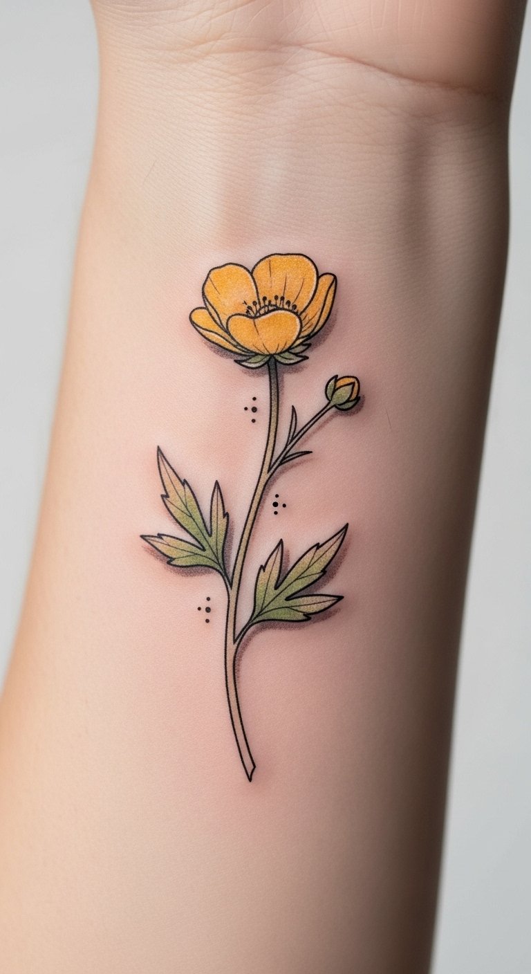 A vibrant yellow buttercup tattoo bursts with life, capturing the essence of sunshine and joy.