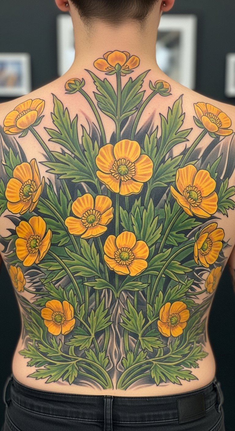 For placement, the design spans the upper and lower back with a central buttercup cluster as focal point, vines and smaller wildflowers radiating outward to follow the spine and shoulder blades; bold linework and layered color gradients emphasize petals and textures while negative space gives the piece room to breathe. Symbolically it represents personal growth and liberation—each petal a milestone and each tendril a connection to past struggles transformed into strength—evoking a sense of resilience, renewal, and natural beauty when viewed across the broad canvas of the back.