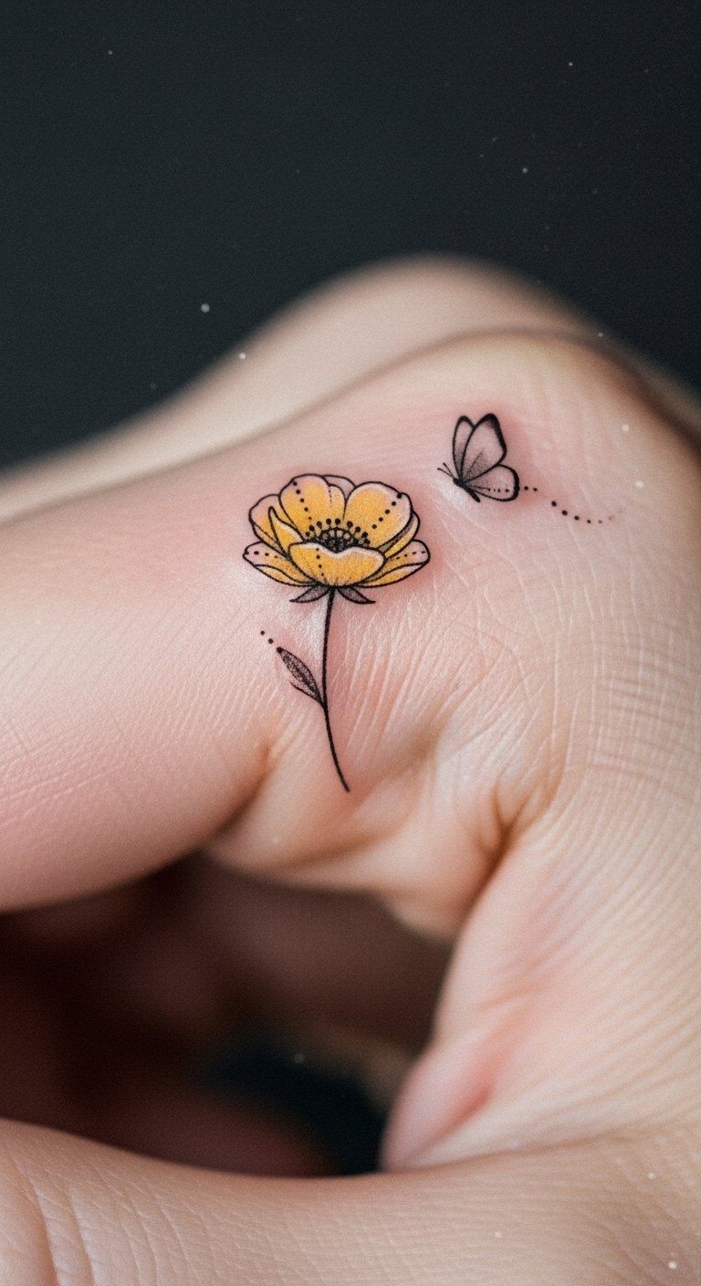 Tiny finger buttercup tattoos capture the delicate essence of nature in a charmingly understated way.