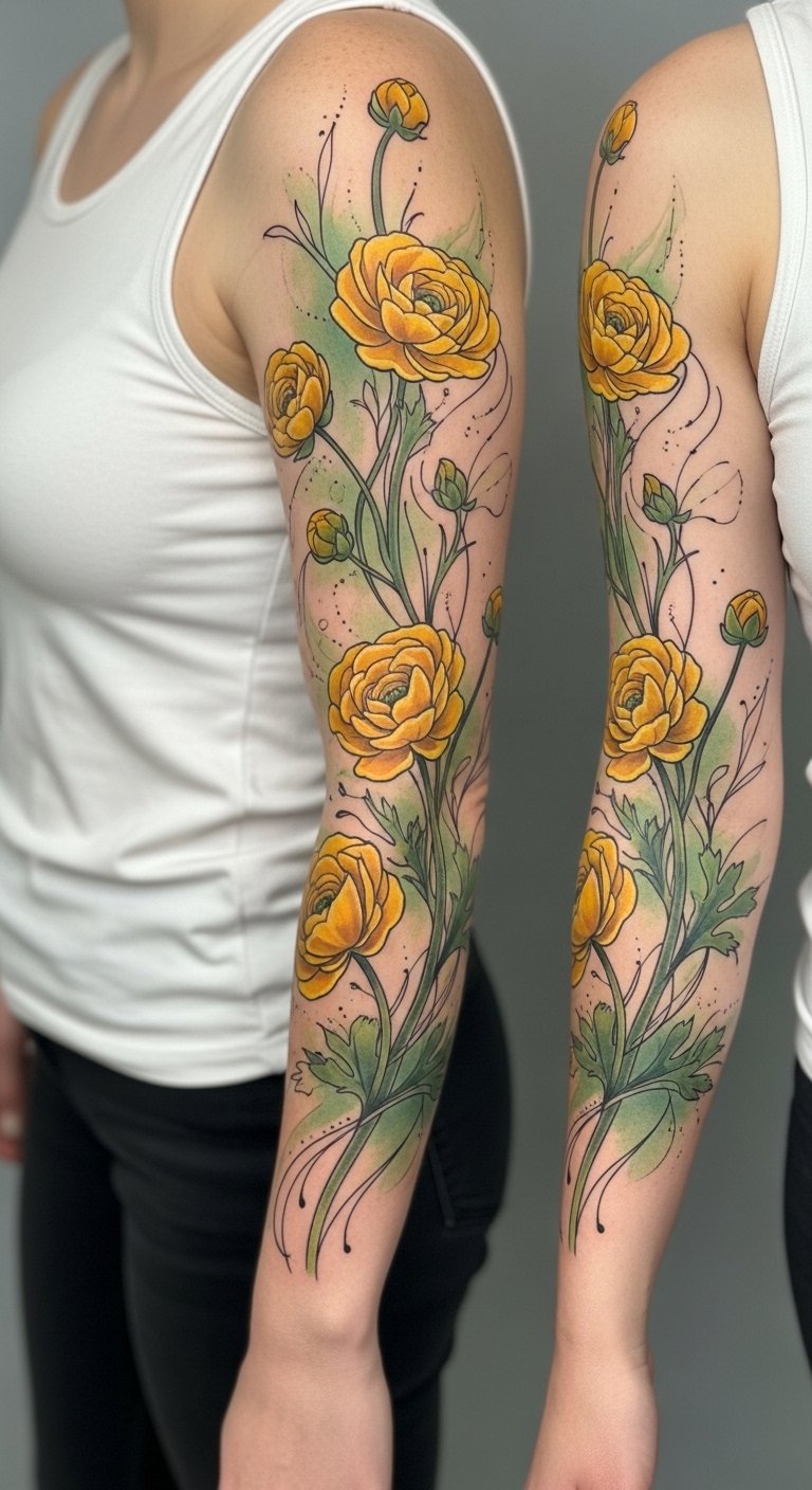A colorful buttercup sleeve tattoo can transform your arm into a vibrant canvas of nature’s beauty, celebrating the delicate charm of these flowers.