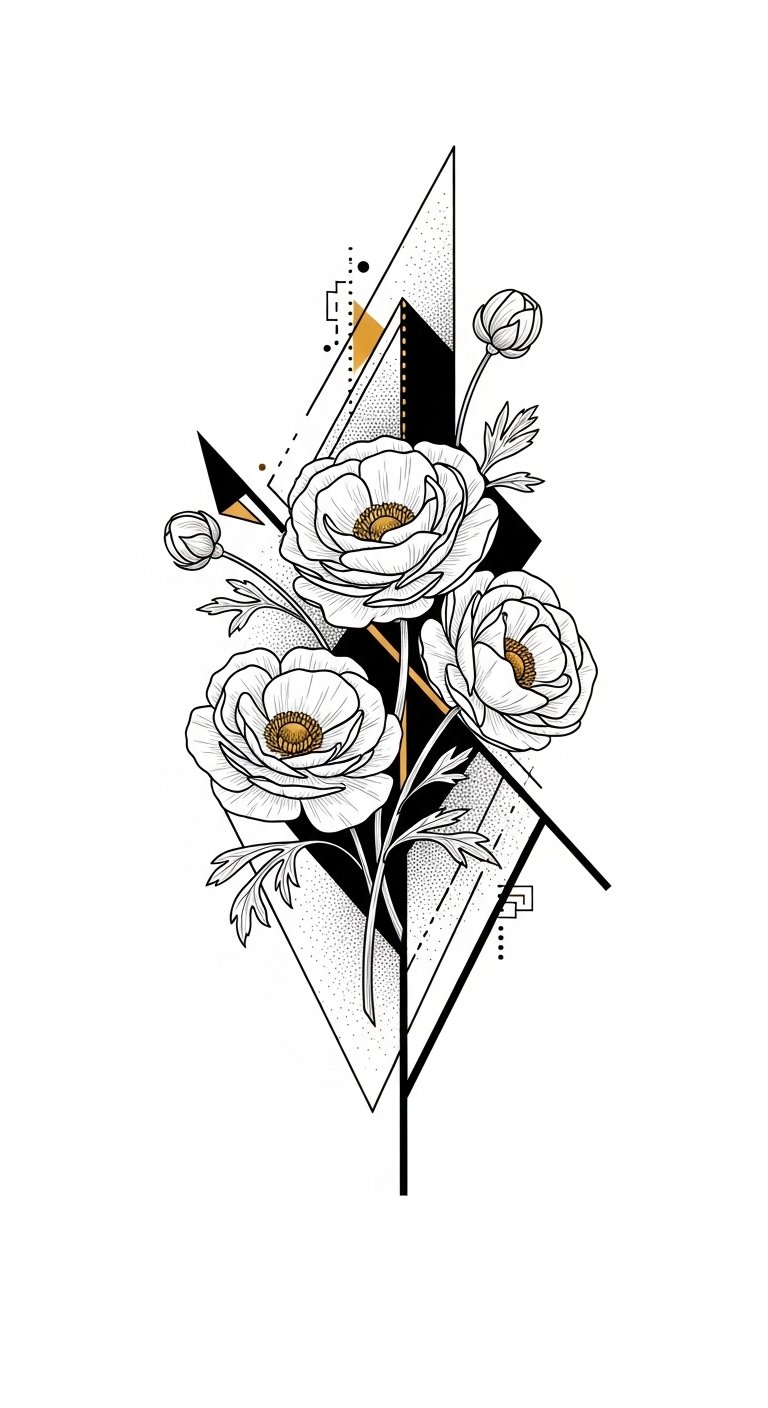 Each sharp angle and soft curve reflects freedom, reminding you to embrace growth and transformation, making this design a powerful symbol of your personal evolution. This placement-forward concept emphasizes balance and contrast: the geometry grounds the organic blooms, evoking resilience and structure while the buttercups symbolize warmth, renewal, and vulnerability.