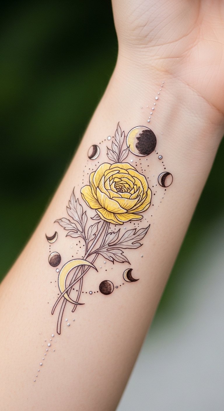The enchanting combination of a buttercup and moon tattoo embodies a poetic dance between nature and the cosmos.