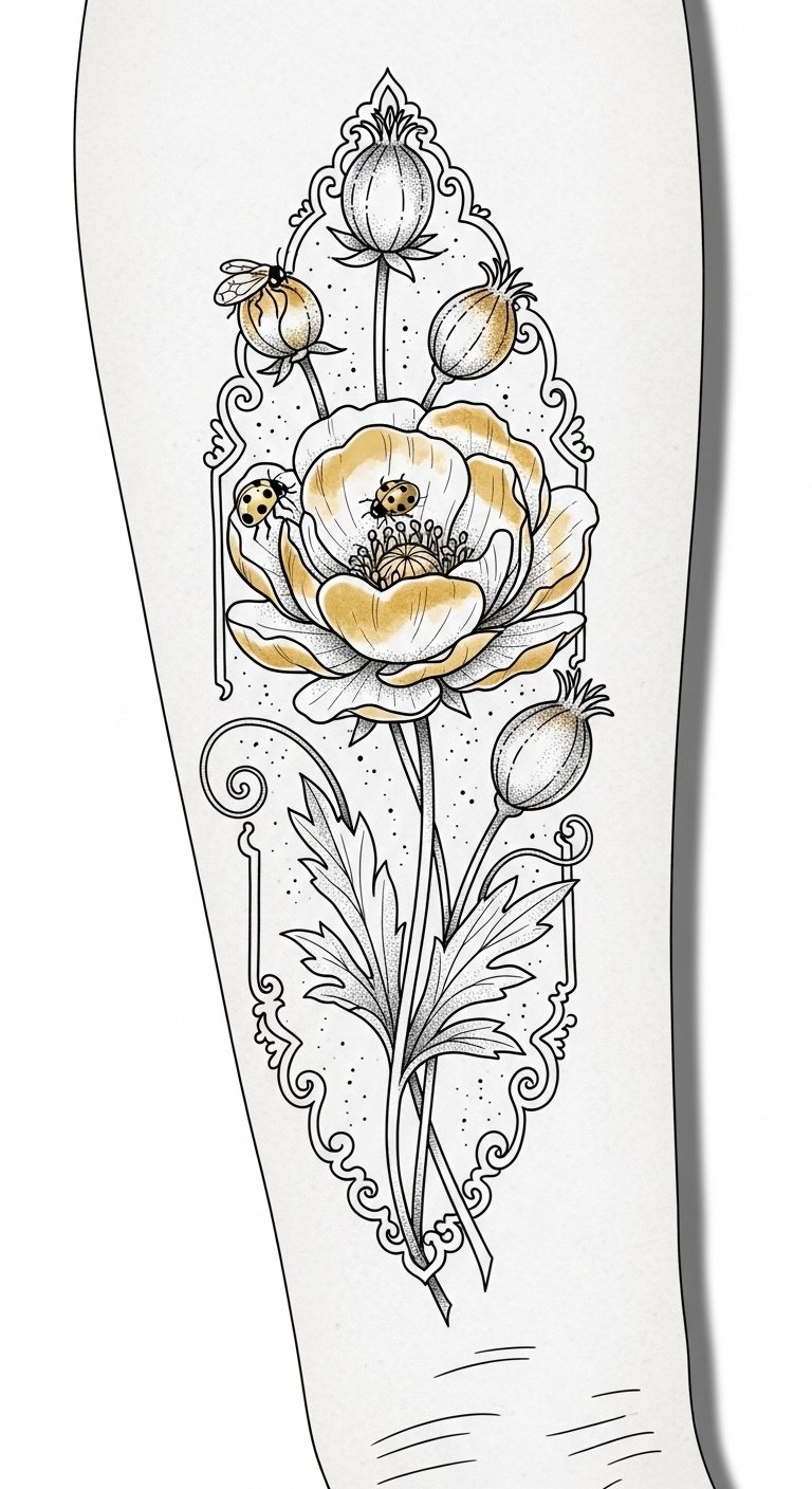 This tattoo concept channels those themes into a delicate, wearable piece that feels personal and wistful; the fine lines and warm gold washes suggest gentle optimism, the added seed pods hint at potential and continuity, and the small ladybug introduces playful luck—best placed on the inner wrist, forearm, or behind the ear where its intimate scale and nostalgic mood can be easily seen and privately felt.
