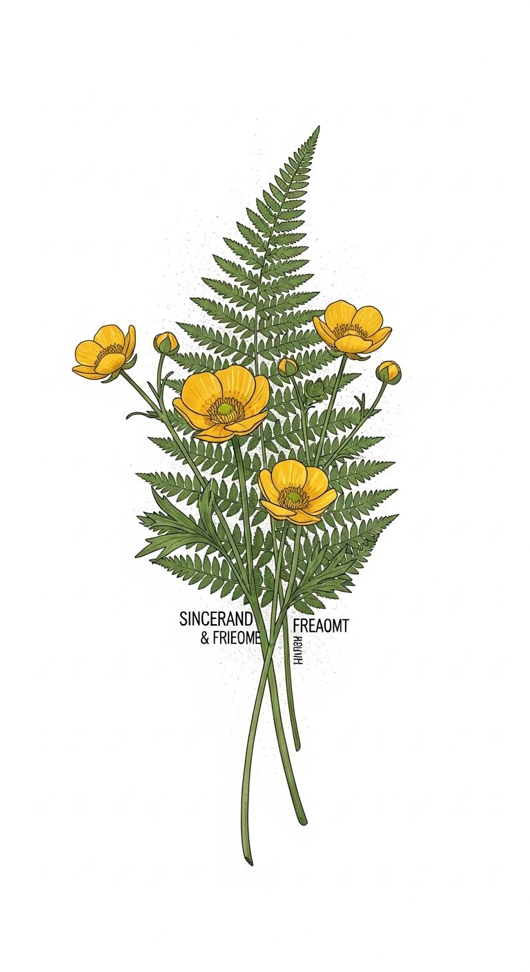 This layered design not only showcases the delicate beauty of buttercups but also embraces ferns’ symbolism of sincerity and magic. Together, they form a powerful statement of growth and resilience, inviting you to express your own journey toward freedom and self-discovery.