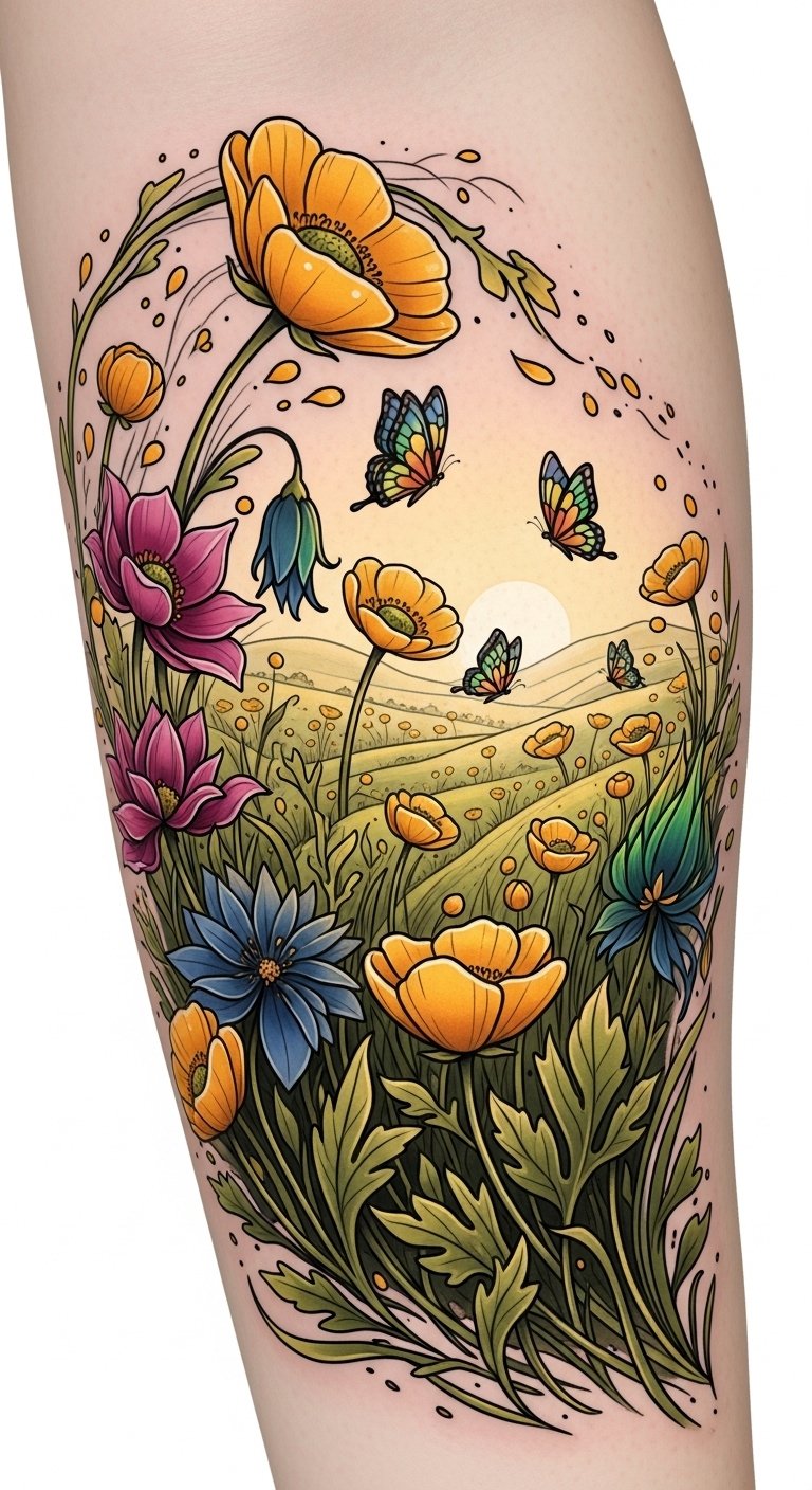 This tattoo design concept draws on the original text’s dreamlike, vibrant imagery to symbolize renewal, joy, and gentle resilience; small butterflies add delicacy and transition, golden buttercups represent warmth and optimism, and the flowing breeze lines suggest movement and personal growth. Emotionally it feels uplifting and serene—suited for an outward-facing placement like the forearm or calf where the scene can “dance” with the body’s motion, or as a shoulder blade piece that allows for a larger, painterly composition blending light and color.