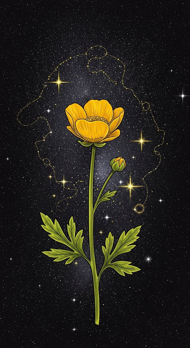 This design captures the essence of buttercup symbolism—growth, joy, and the beauty of life—while the moon phases represent transformation and freedom.