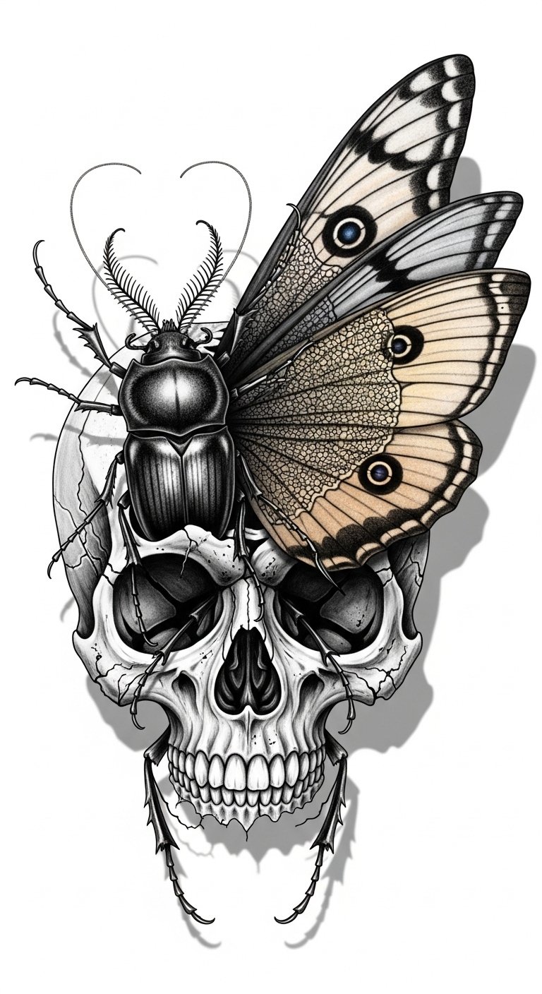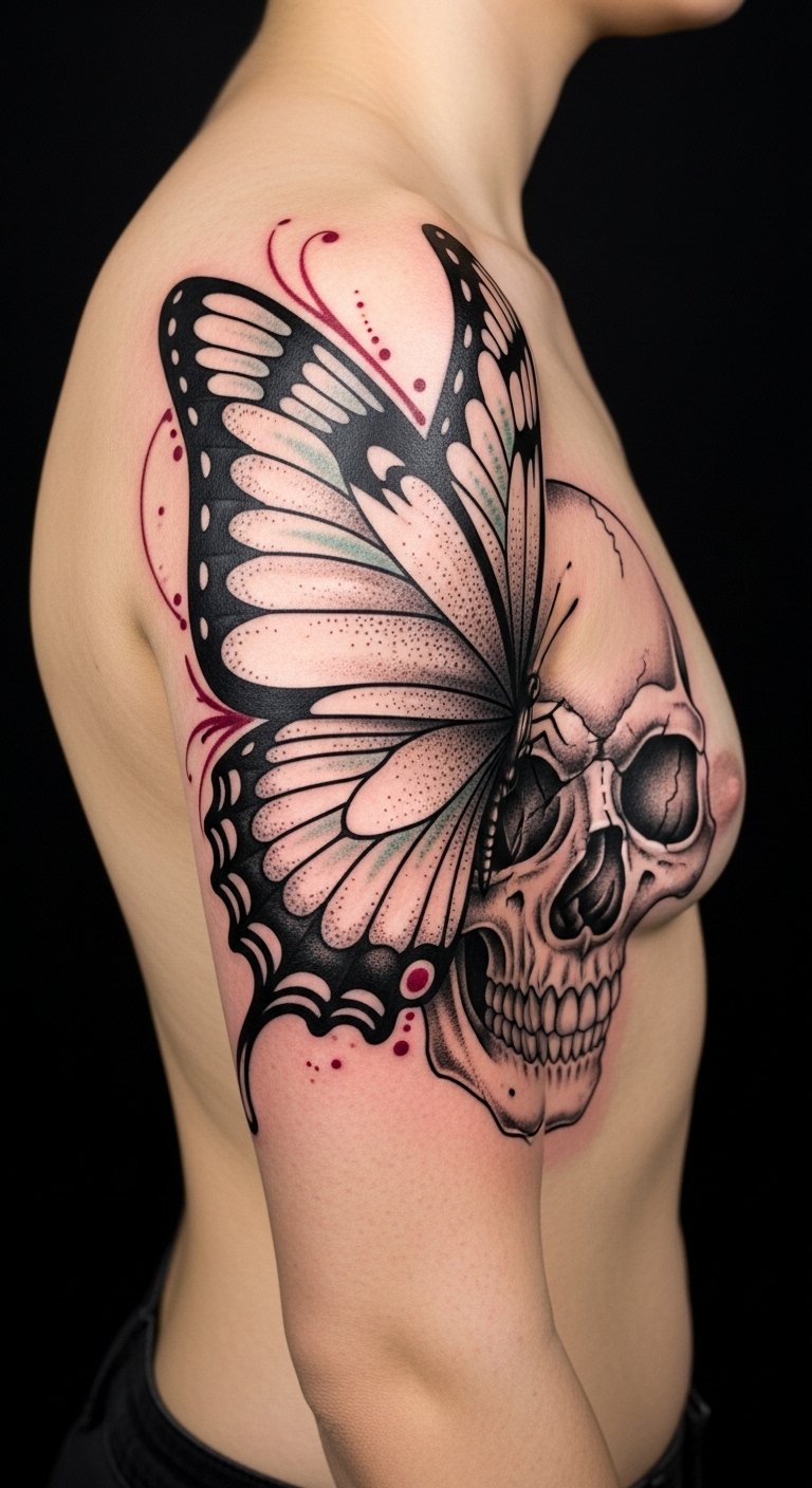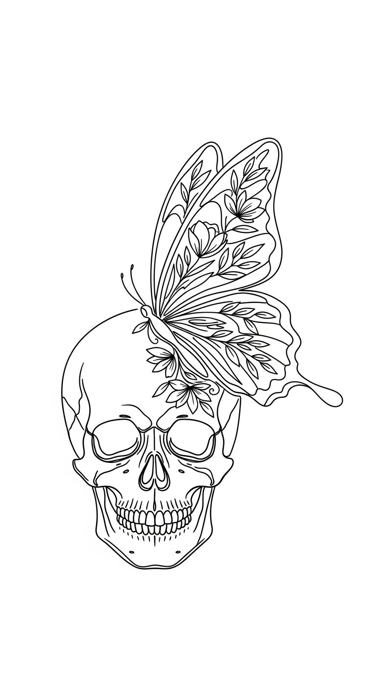 This composition combines delicately detailed butterfly wings emerging from a realistically shaded skull, intertwined with vines, blossoms, and subtle moths; use fine linework, soft gradients, and selective color (muted pastels against monochrome bone) to emphasize contrast; ideal sizes: forearm band (wraparound), upper back central, or ribcage vertical panel; conveys transformation, mortality, resilience, and bittersweet hope—evoking introspection and acceptance when placed where it can be seen or kept intimate.